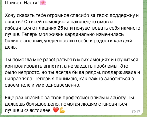 Готовы сделать первый шаг к более спокойной и принимающей жизни? Напишите мне, чтобы задать вопросы или записаться на первую встречу.