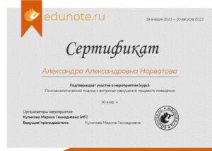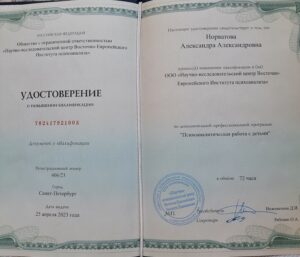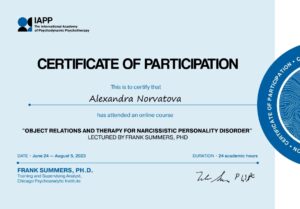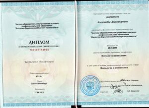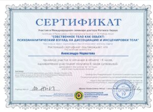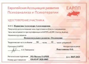 - Специалист Европейской Ассоциации Развития Психоанализа и Психотерапии (ECPP, Вена, Австрия)