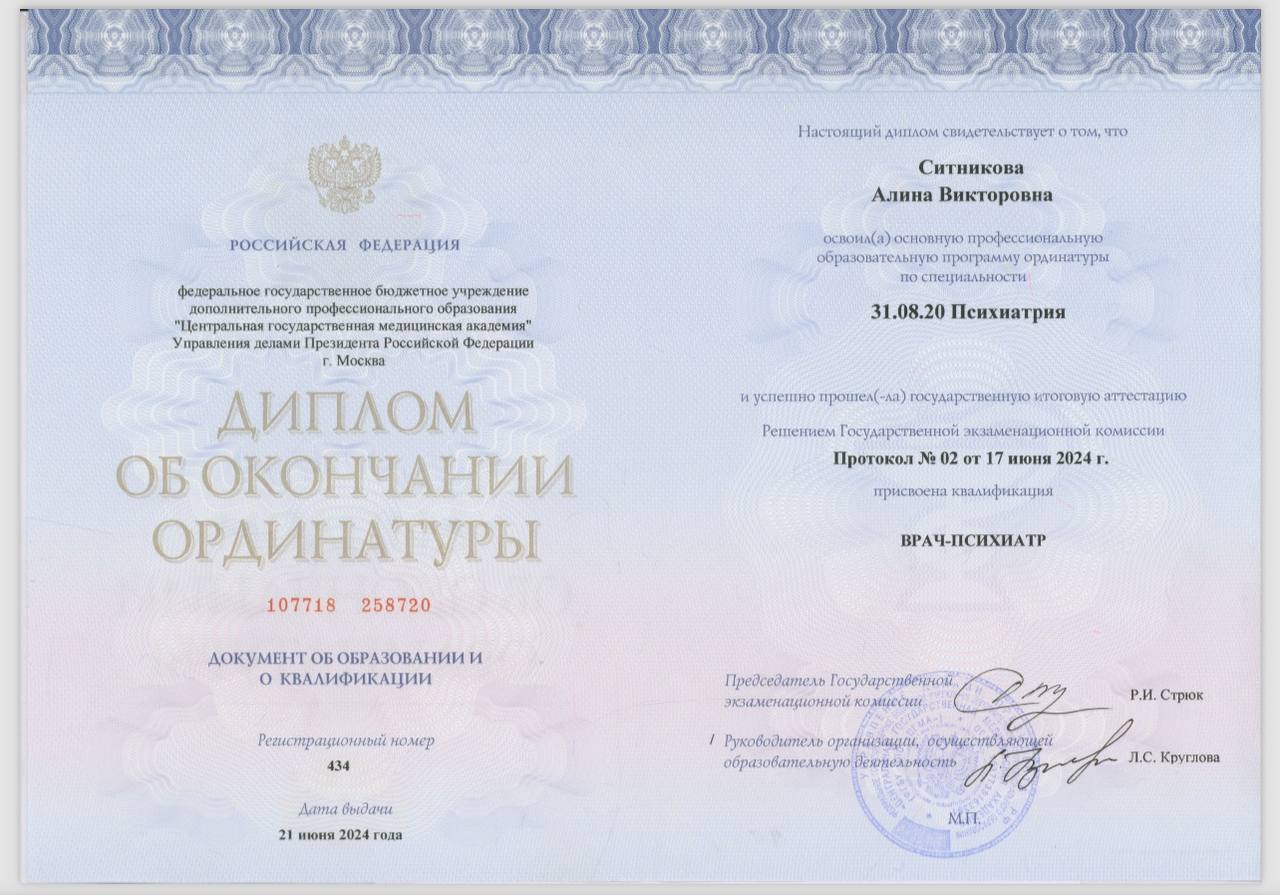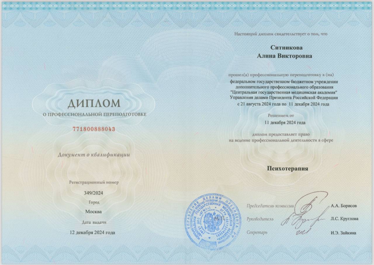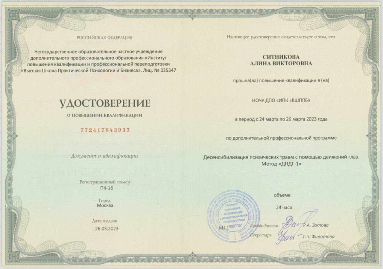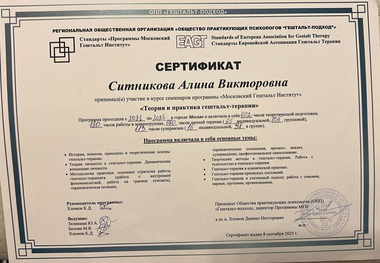 Врач психотерапевт, владею техниками EDMR, КПТ, Арт, являюсь Гештальт терапевтом ( окончила 2 ступень), состою в Гештальт сообществе. Прохожу личную терапию, личные супервизии, групповые супервизии, посещаю конференции, являюсь автором мединской научной статьи.