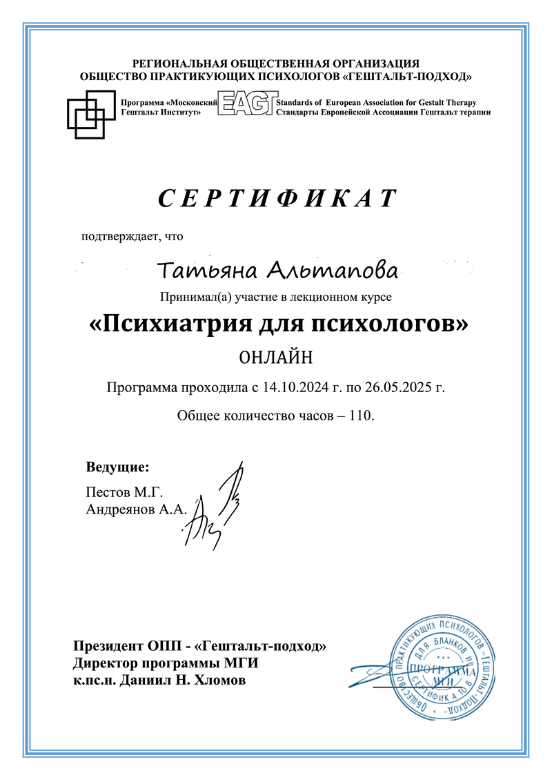 Имею постоянную личную терапию 3 года, беру супервизии. Продолжаю обучение на гештальт-терапевта в МГИ. В настоящее время являюсь психологом фонда "Душа Мамы" г. Москва.