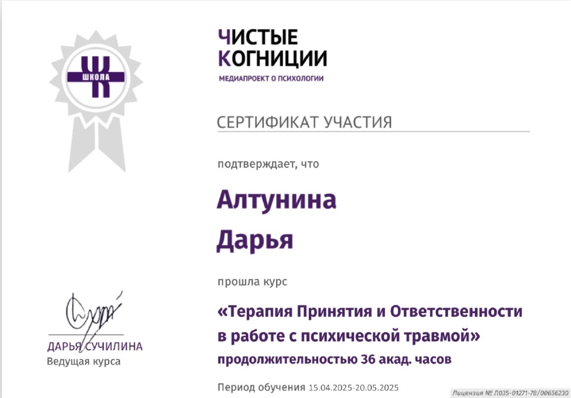 Меня зовут Дарья, я клинический психолог, когнитивно-поведенческий и ТПО психотерапевт. Автор книги «Психологические проблемы наркозависимости», автор ряда научных статей по проблеме наркозависимости. Опыт работы с 2021 г. Опыт личной терапии более 130 часов. В работе строго соблюдаю этический кодекс психолога.