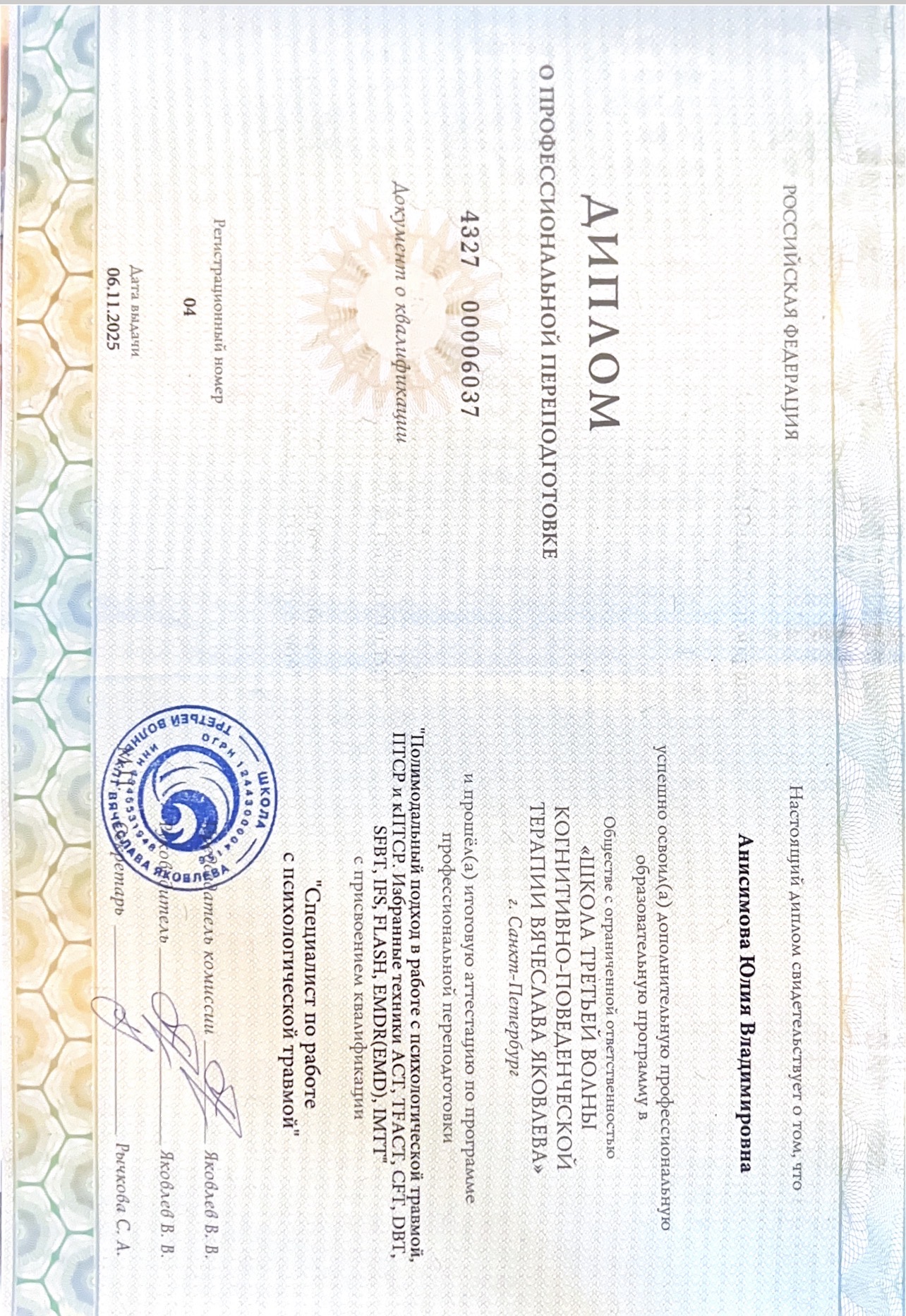 Клинический психолог, КПТ-психолог, специалист по работе с психологической травмой, 35 летС кем работает специалист: взрослые