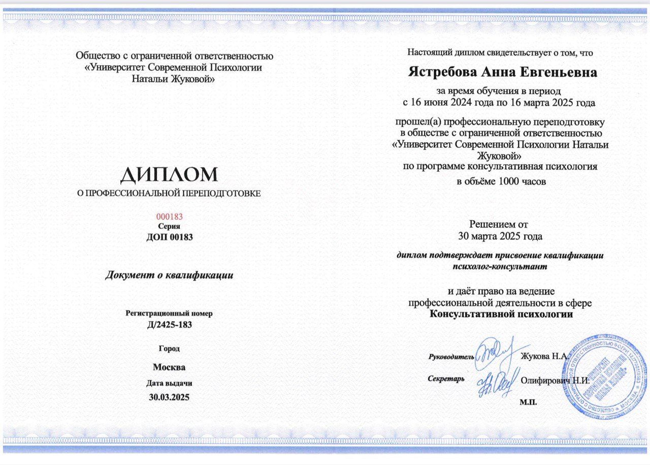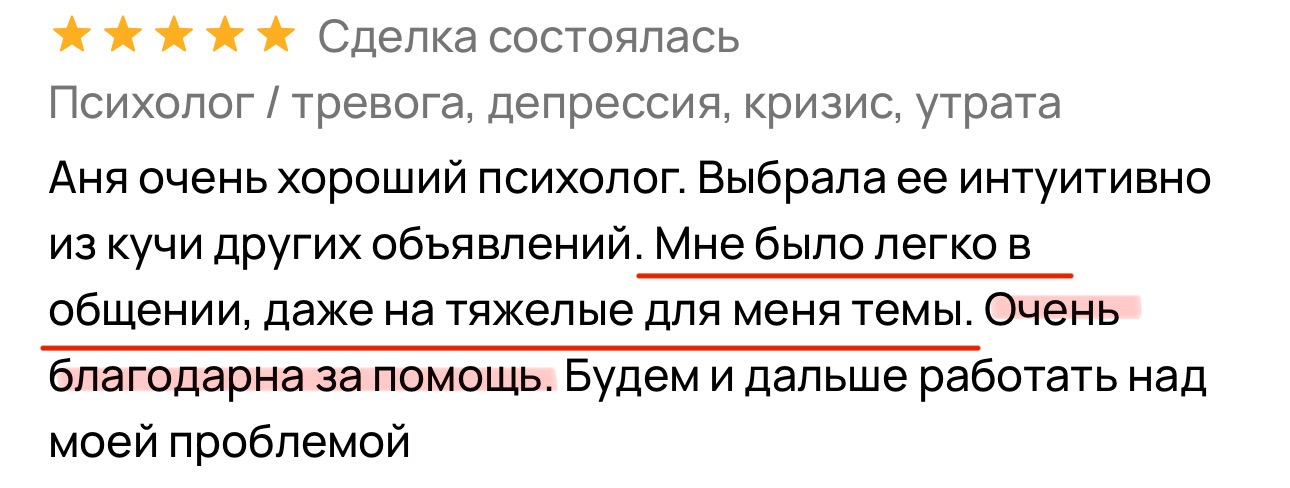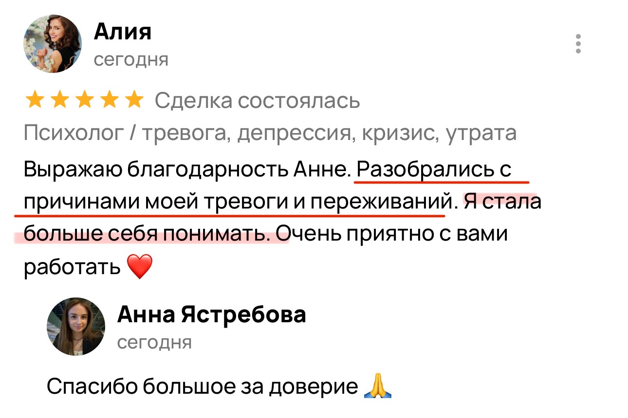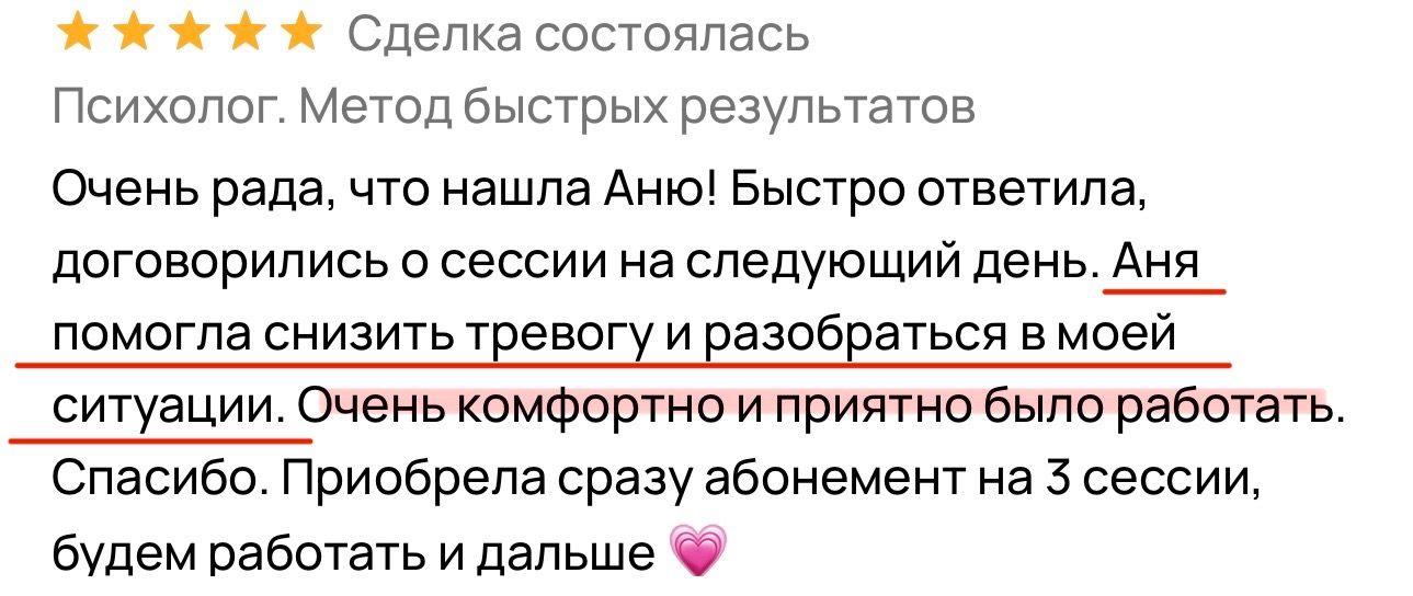 Меня зовут Аня, я психолог с высшим образованием. Работаю только онлайн.