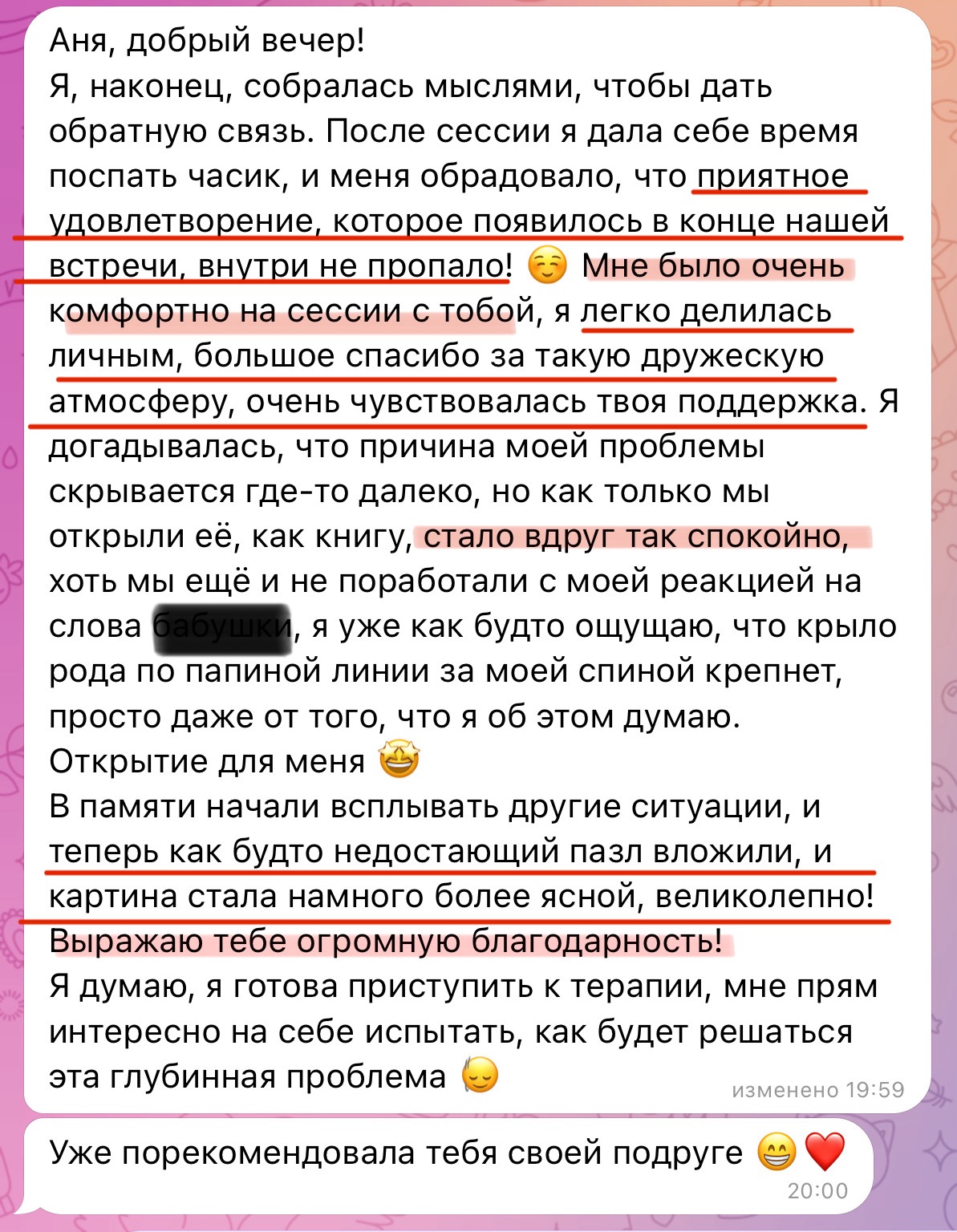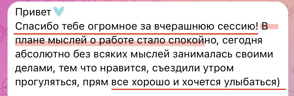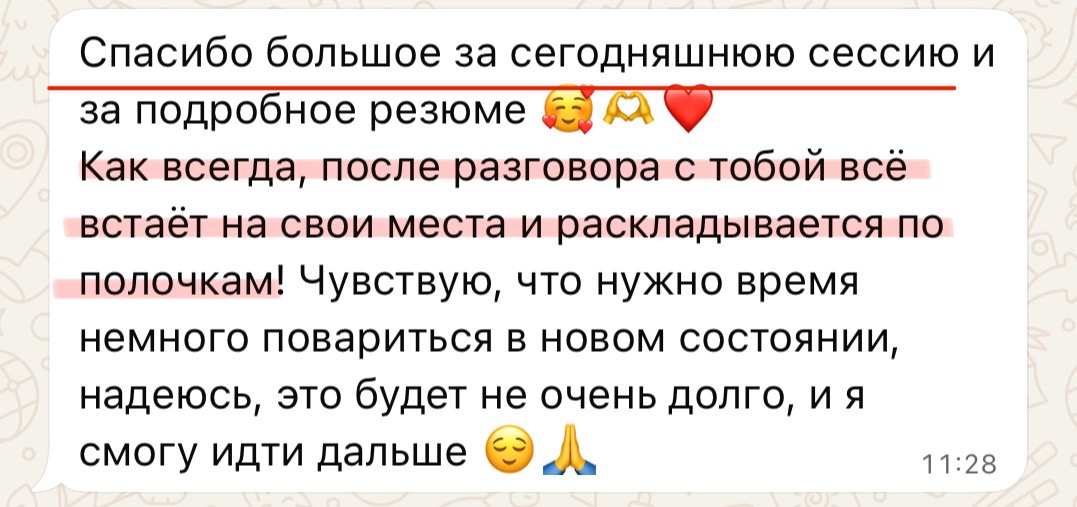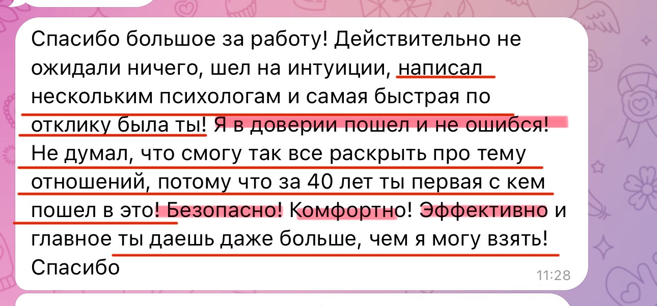 Не растягиваю работу с клиентами на годы. Работаю методом быстрых результатов, с помощью которого одной сессии может быть достаточно при четком запросе на узкую тему. Работаю быстро, эффективно, качественно и бережно 🤍