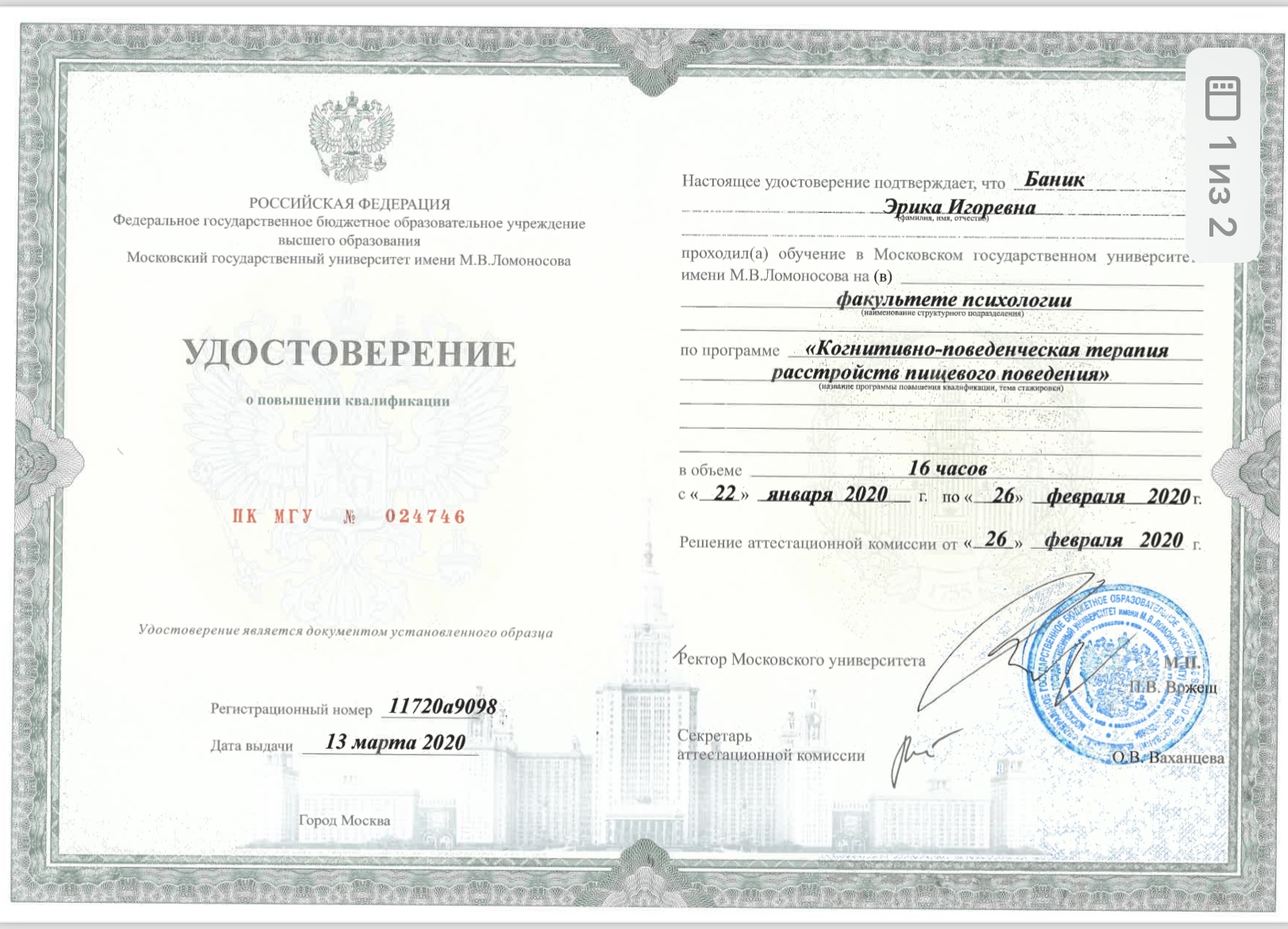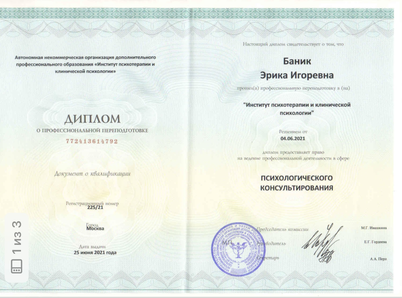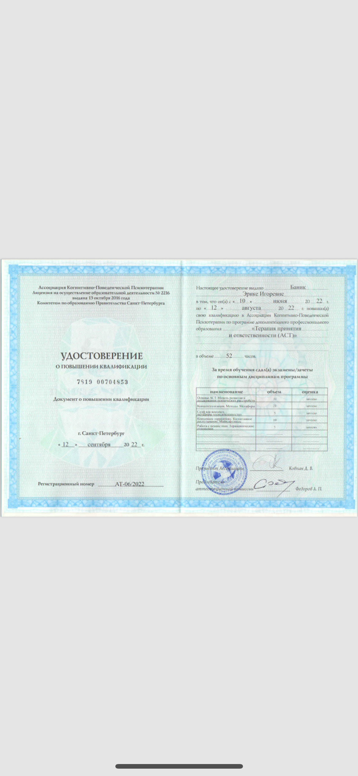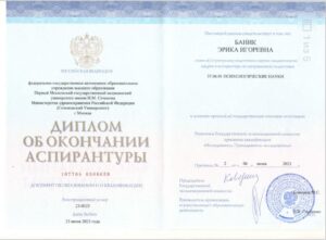 По образованию я клинический психолог, когнитивно - поведенческий терапевт, имею трехлетнюю клиническую практику в стационаре психиатрической больницы, а также опыт частной работы. В 2023 году с отличием окончила аспирантуру Первого МГМУ им И. М. Сеченова и готовлюсь к защите диссертации.