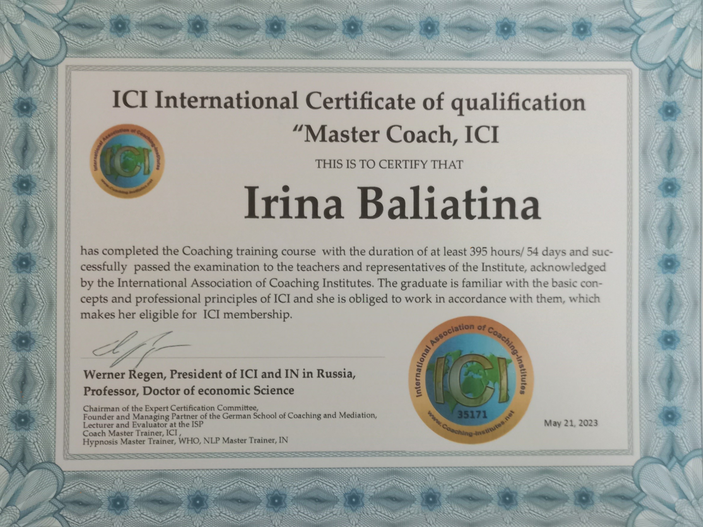 Сертифицированный Мастер-коуч, член Международной Ассоциации ICI