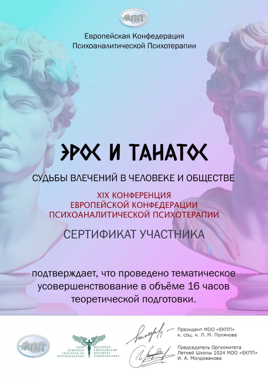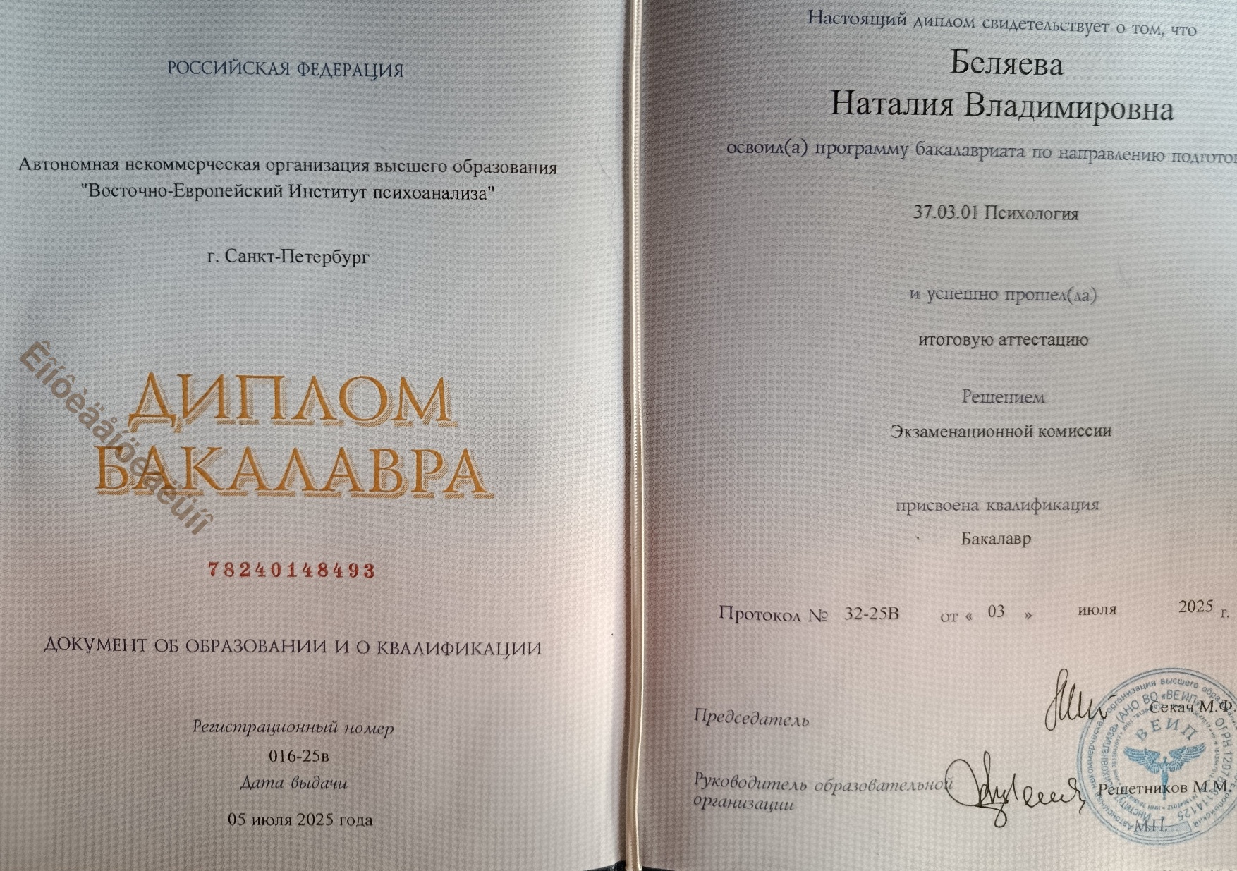 - АНО «Восточно-Европейский институт психоанализа» (ВЕИП), психолог-психоаналитик