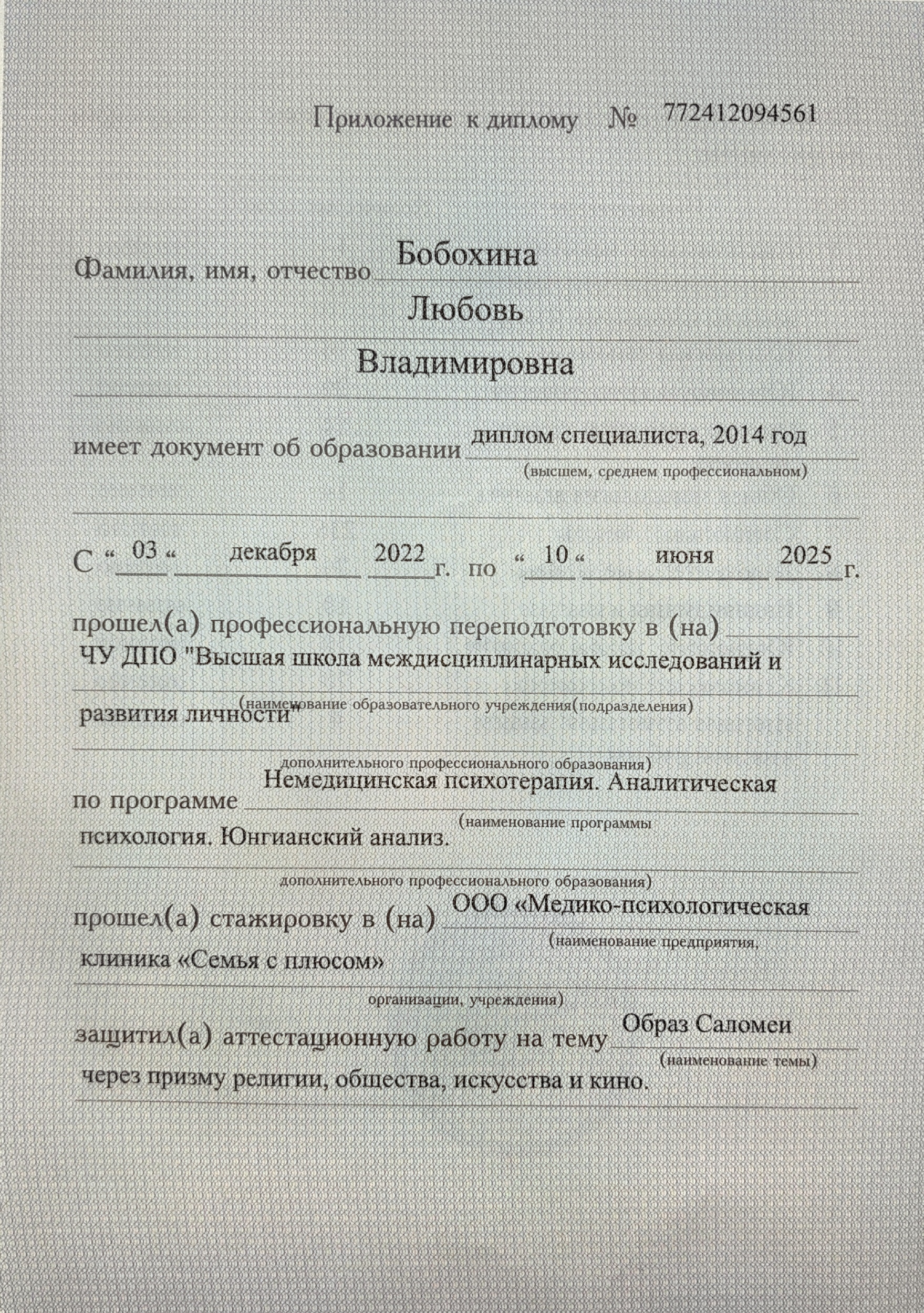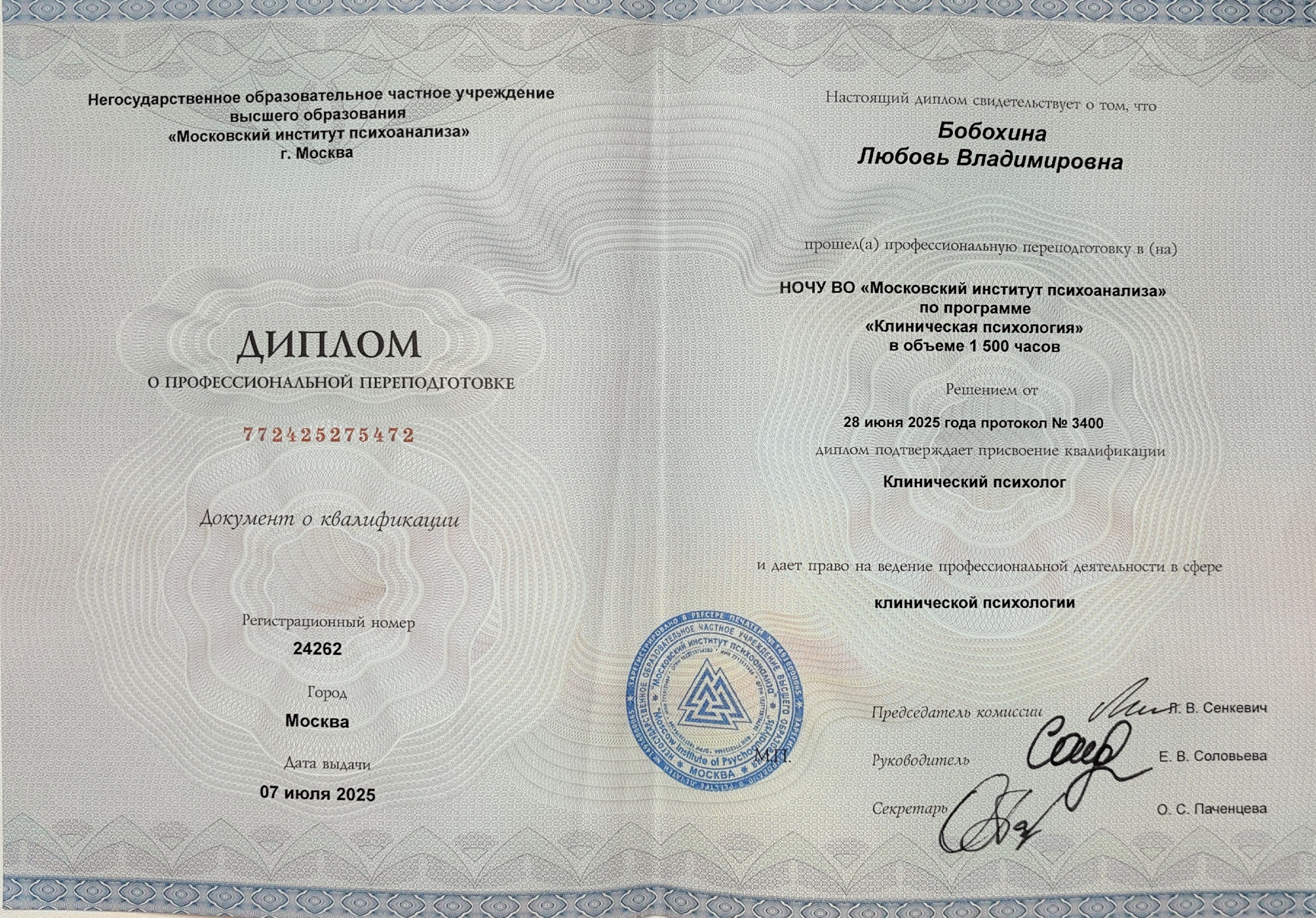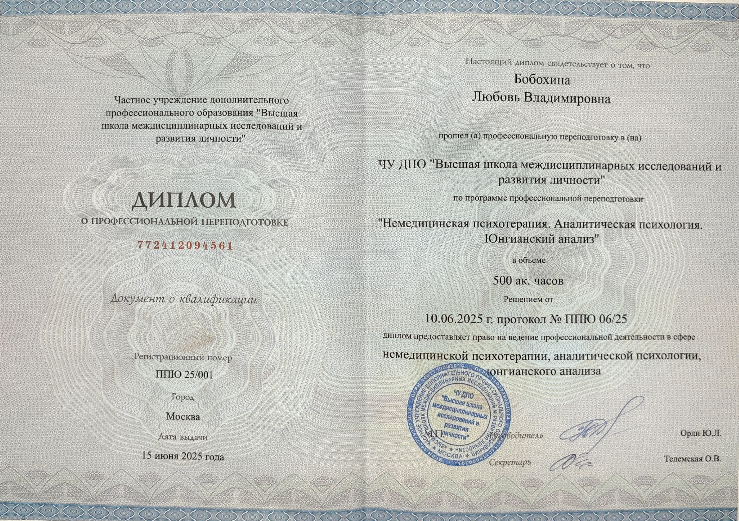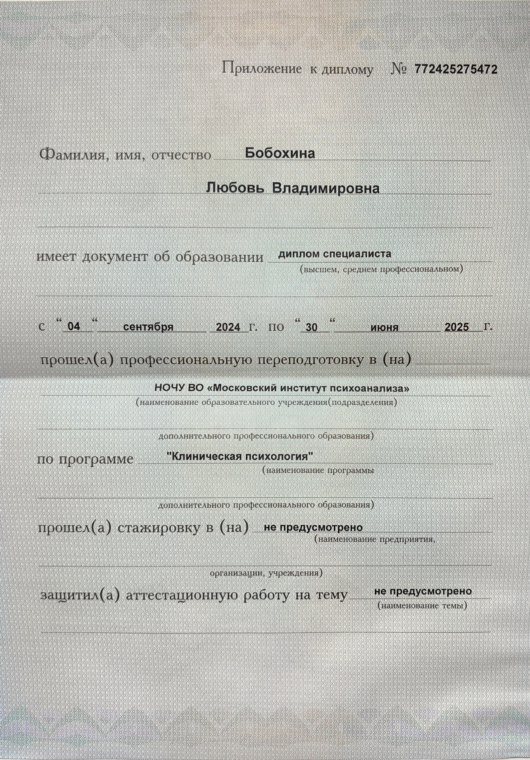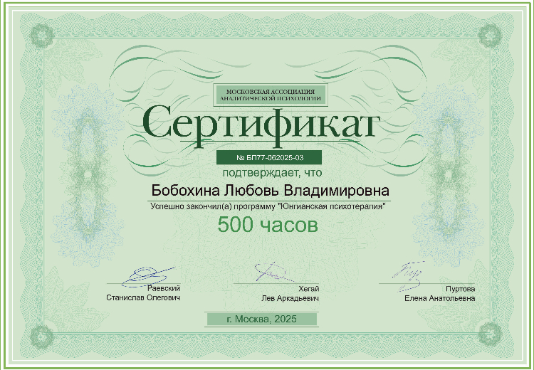 Здравствуйте! Меня зовут Любовь Бобохина. Работаю в подходе не классического психоанализа, так же клинической психологии. Являюсь членом Московской Ассоциации Аналитичеких Психологов (МААП).