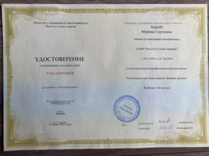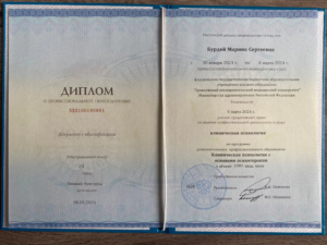 2023-2024 закончила профпереподготовку по специальности клинической психологии в Приволжском Медицинском Университете (ПИМУ).