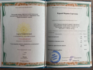 С 2021-2023 год обучалась в Центре Когнитивной Терапии (ЦКТ) по специальности когнитивно поведенческий терапевт.