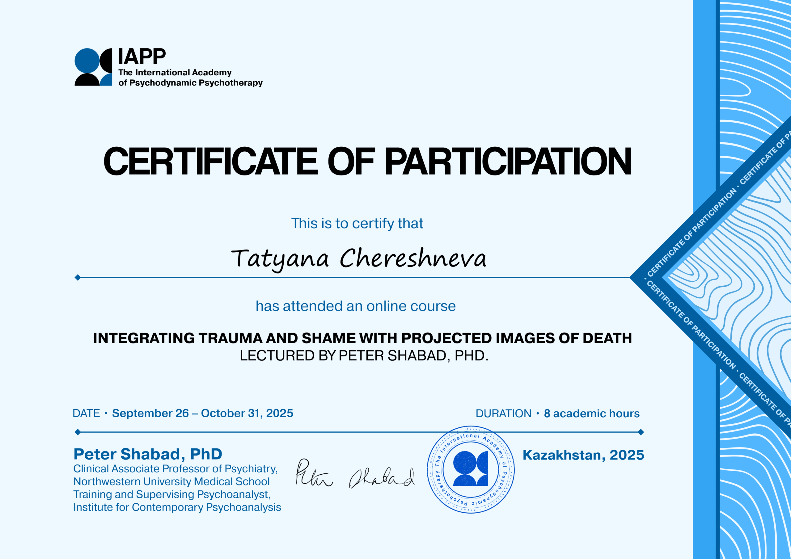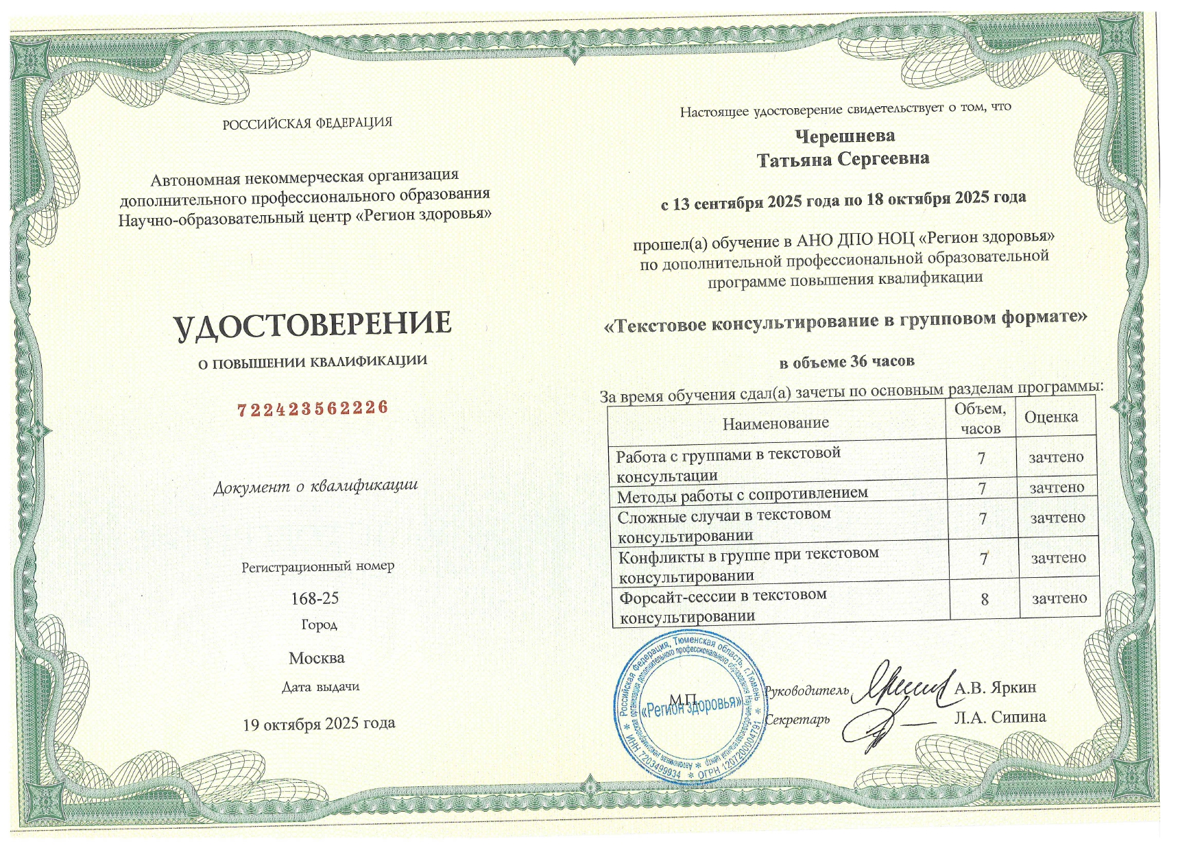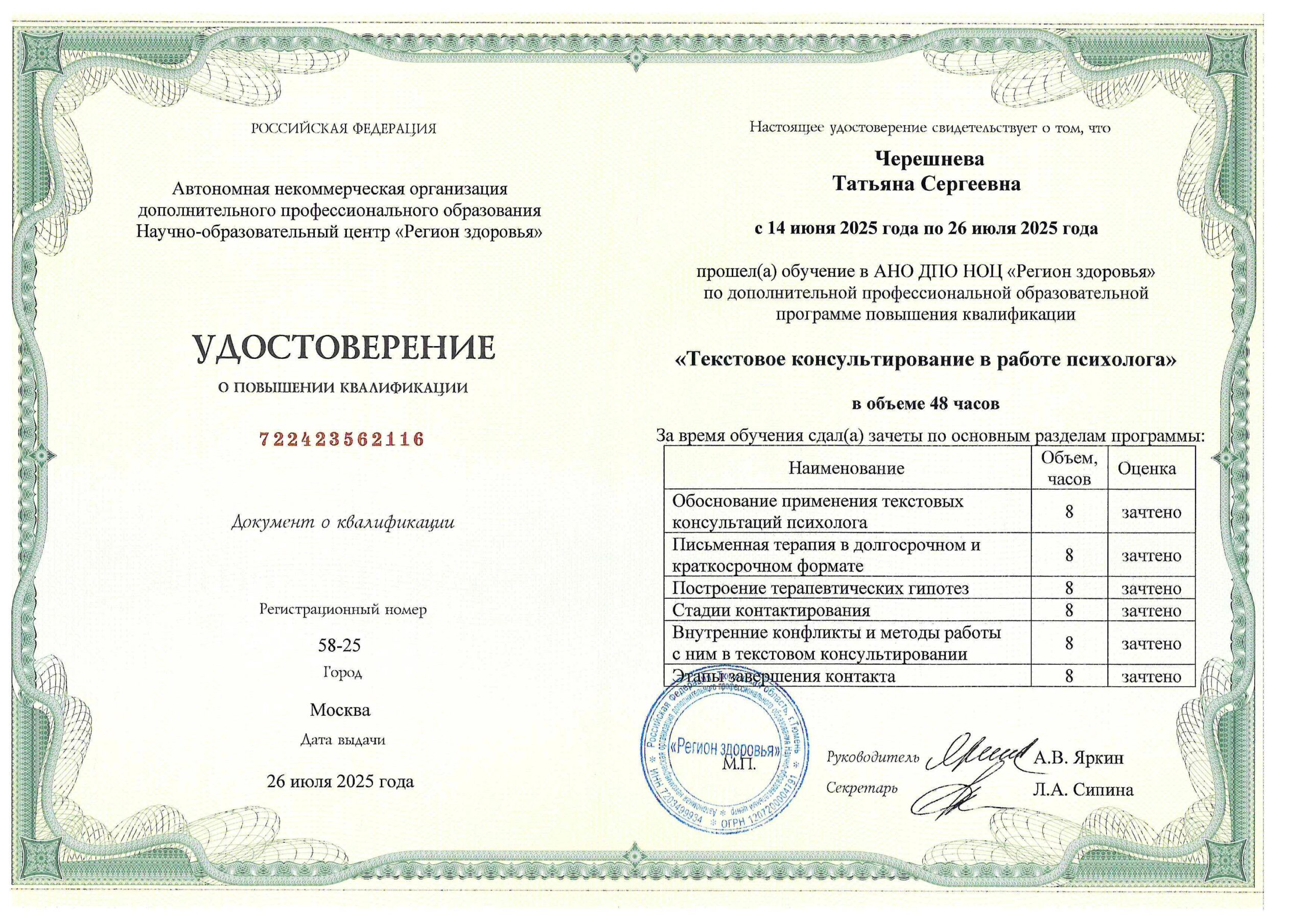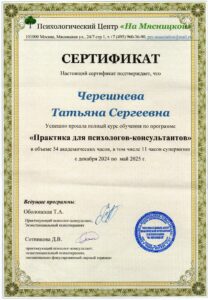 Регулярно прохожу супервизию, нахожусь в длительной личной терапии в глубинном подходе. На данный момент дополнительно обучаюсь экзистенциальной психотерапии (ИОН РАНХиГС).