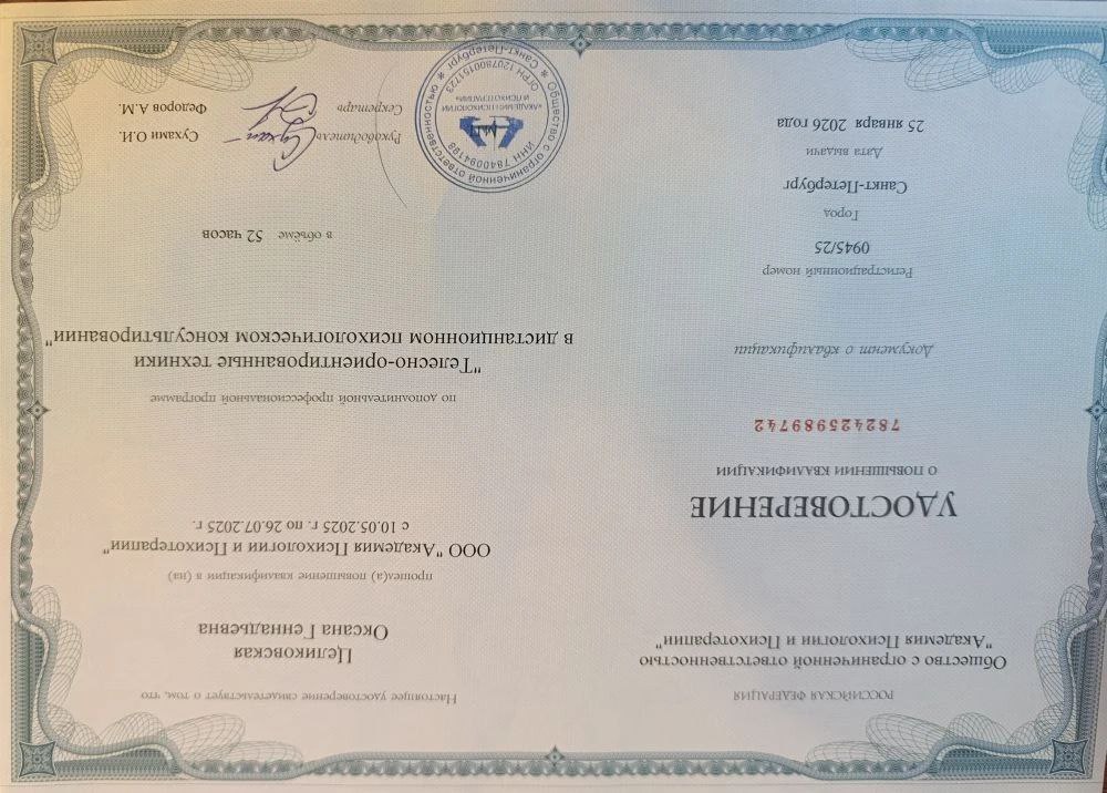 Более 4-х лет веду частную рпактику, провела более 2000 часов сессий