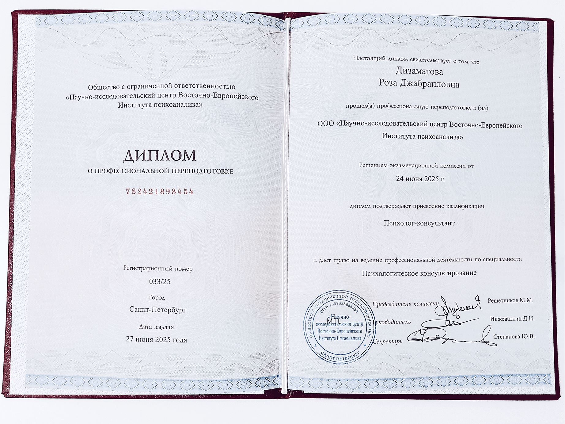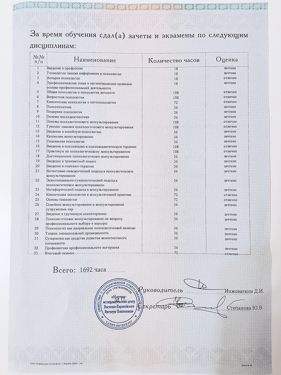 Для меня является ценностью учиться и развиваться в профессии. Нахожусь в личной терапии, считаю это обязательным условием для качественной работы. Прохожу повышения квалификации, посещаю семинары и регулярные супервизии, изучаю профессиональную литературу.