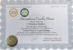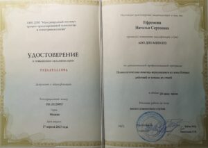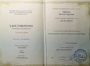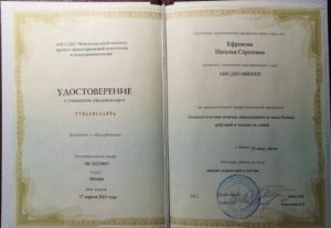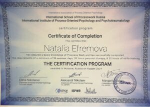 Сертификат Международного образца. АНО ДПО «Международный институт процесс-ориентированной психологии и психотравматологии» (2022 - 2024).