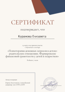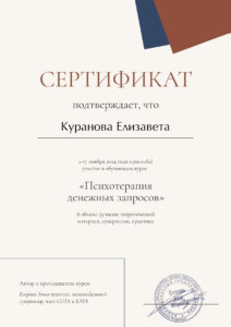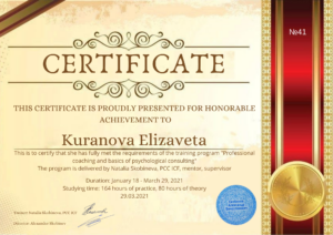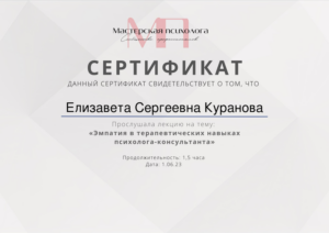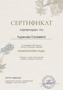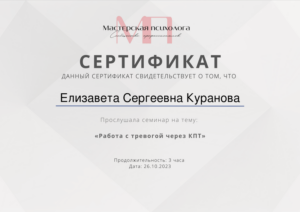 Я сторонник основательного и вдумчивого подхода, поэтому обучение психологии я начала с получением второго высшего образования и успешно завершила его. При этом для меня важна практическая составляющая обучения, поэтому я выбираю практикоориентированные программы с международной сертификацией. А также я непрерывно супервизируюсь индивидуально и в группе, прохожу личную психотерапию, участвую в психологических мастерских, мастер-классах и конференциях.