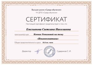 Я- дипломированный психолог-консультант, специалист по психосоматике и эриксоновскому гипнозу, специалист в подходе ОРКТ и ДПДГ.