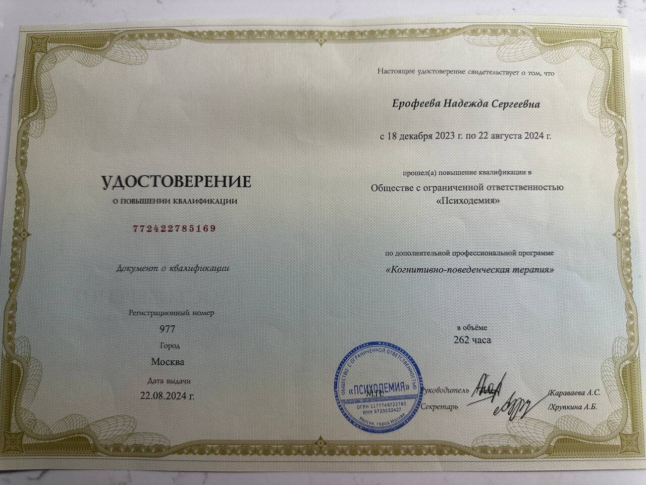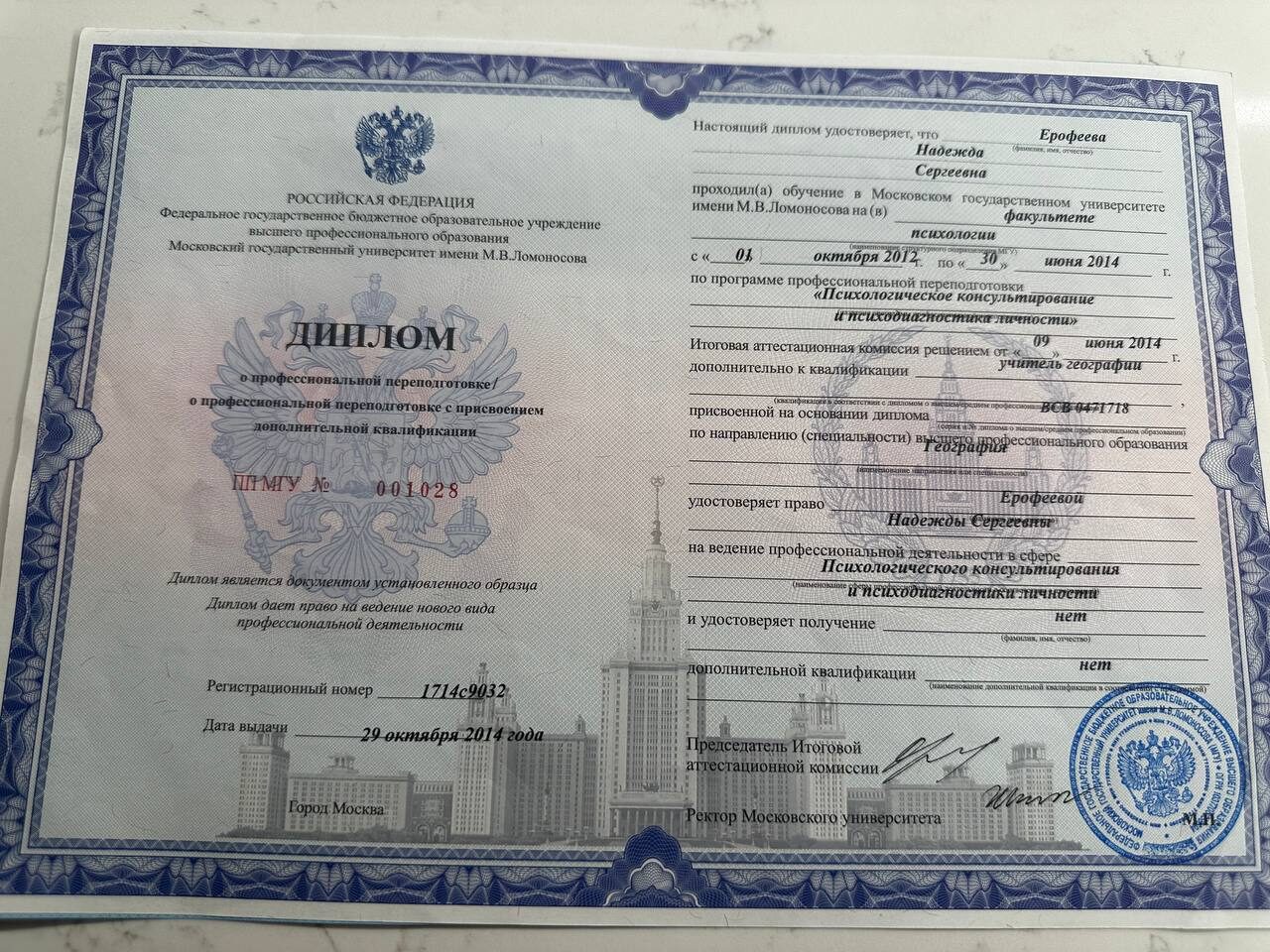 Меня зовут Надежда, я дипломированный психолог с опытом работы более 13 лет. Окончила психологический факультет МГУ. На данный момент я совершенствую знания обучаясь в магистратуре по направлению психотерапии постстрессовых расстройств в Московском институте психоанализа. Я также регулярно посещаю специализации, конференции, семинары, прохожу личную терапию и супервизию.