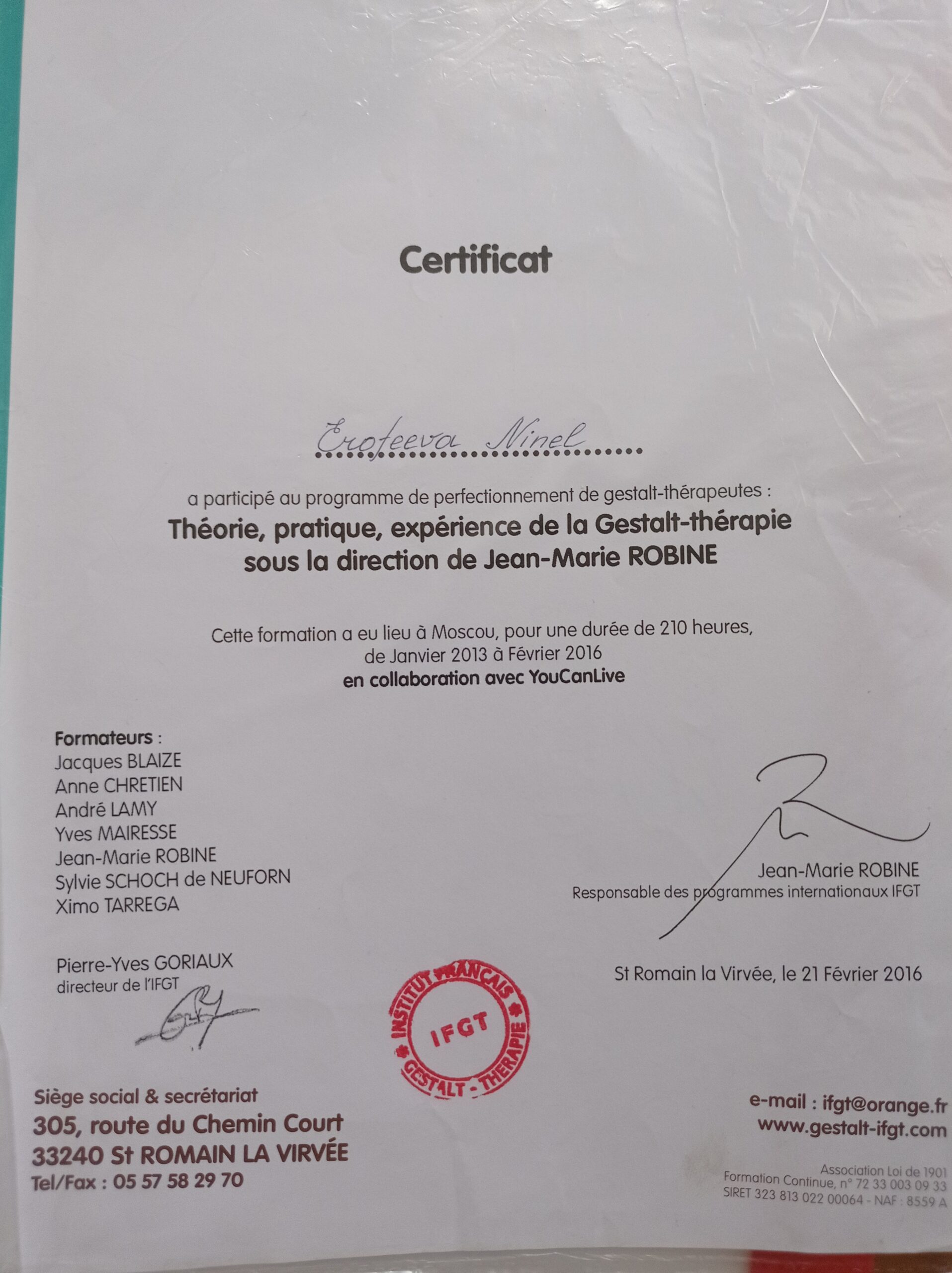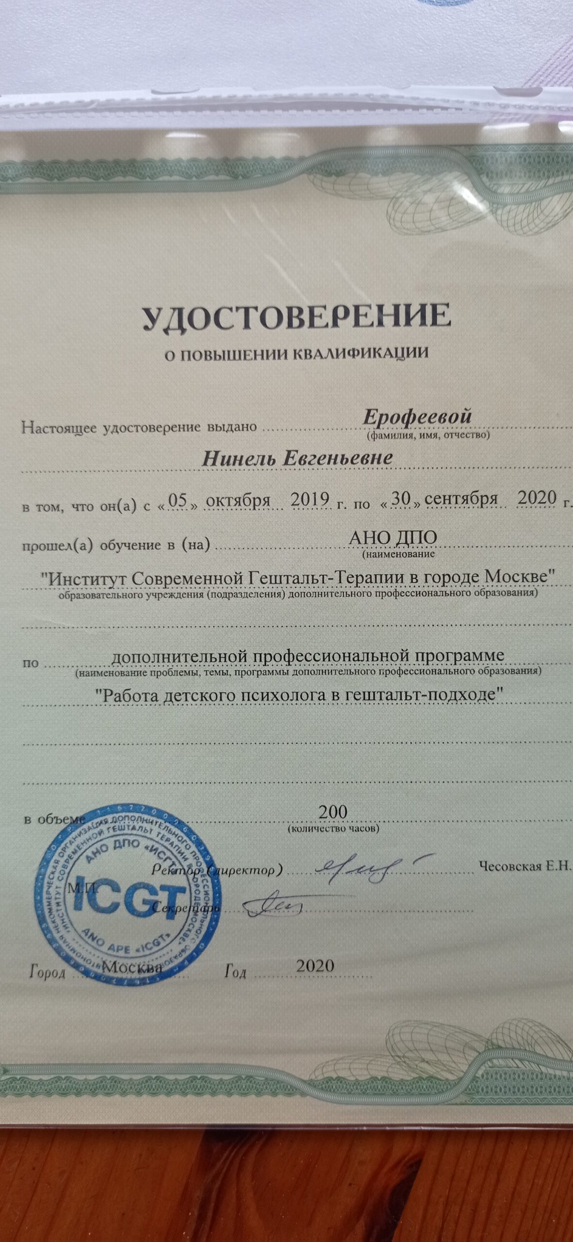 Продолжаю динамично обучаться и развиваться. В настоящее время осваиваю феноменологический метод в практике гештальт-терапии.