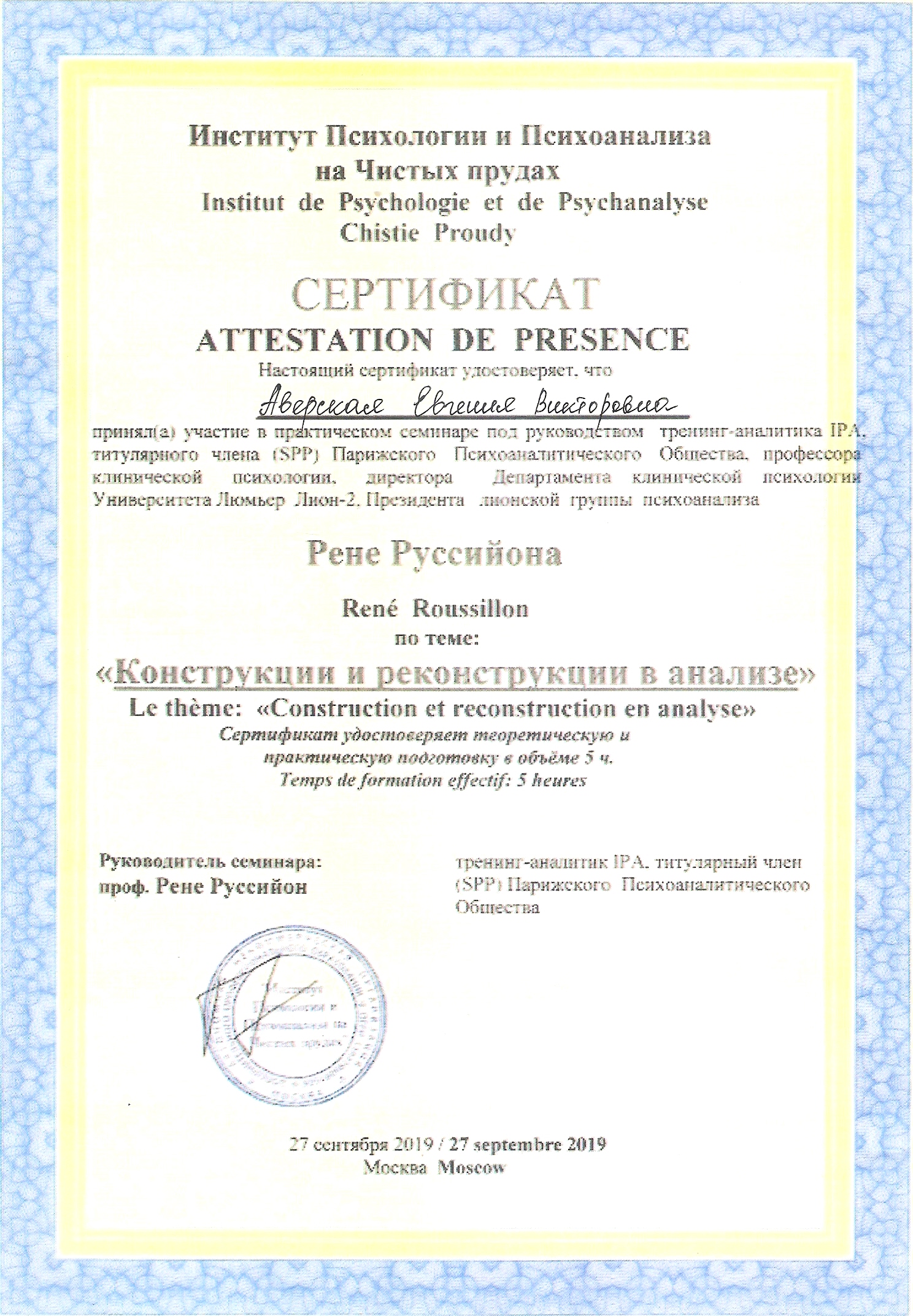 1. Слушатель семинаров Французских психоаналитиков, членов SPP и IPA: Р. Руссийона, В. Капсамбелиса, К. Смаджа