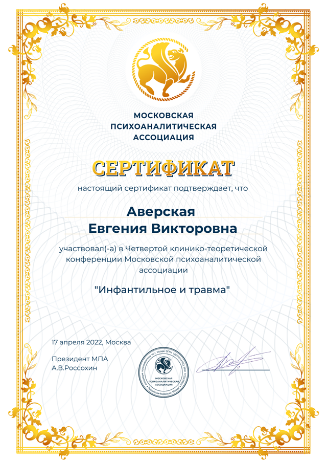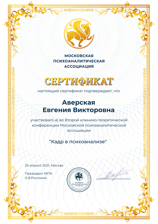 5. Участия в клинико-теоретических конференциях Московской психоаналитической ассоциации (МПА) под руководством д.п.н., психоаналитика, члена IPA и титулярного члена SPP А.В. Россохина в НИУ ВШЭ (Высшей школе экономики)