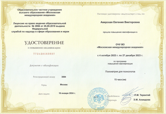 6. "Психиатрия для психологов" в Московской международной академии. Преподаватели: И.В. Журавлев, Ю.В. Журавлева, 72 ак.ч.