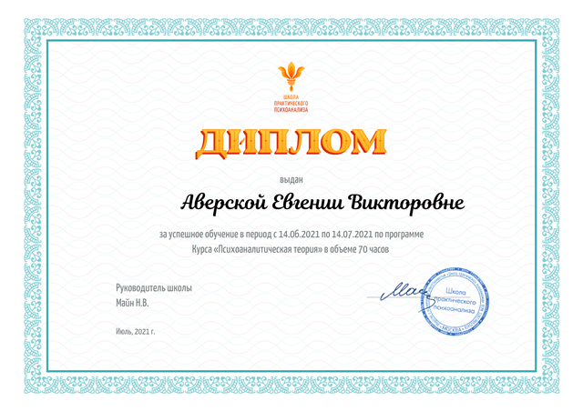 1. "Психоаналитическое консультирование. Теория и практика" от Школы практического психоанализа Н.В. Майн, действующего члена IPA (Международная психоаналитическая ассоциация) и SPP (Парижское психоаналитическое общество), к.п.н., 194 ак.ч.