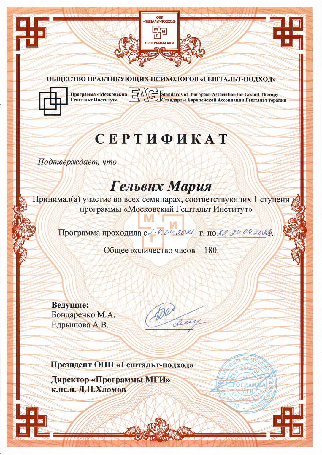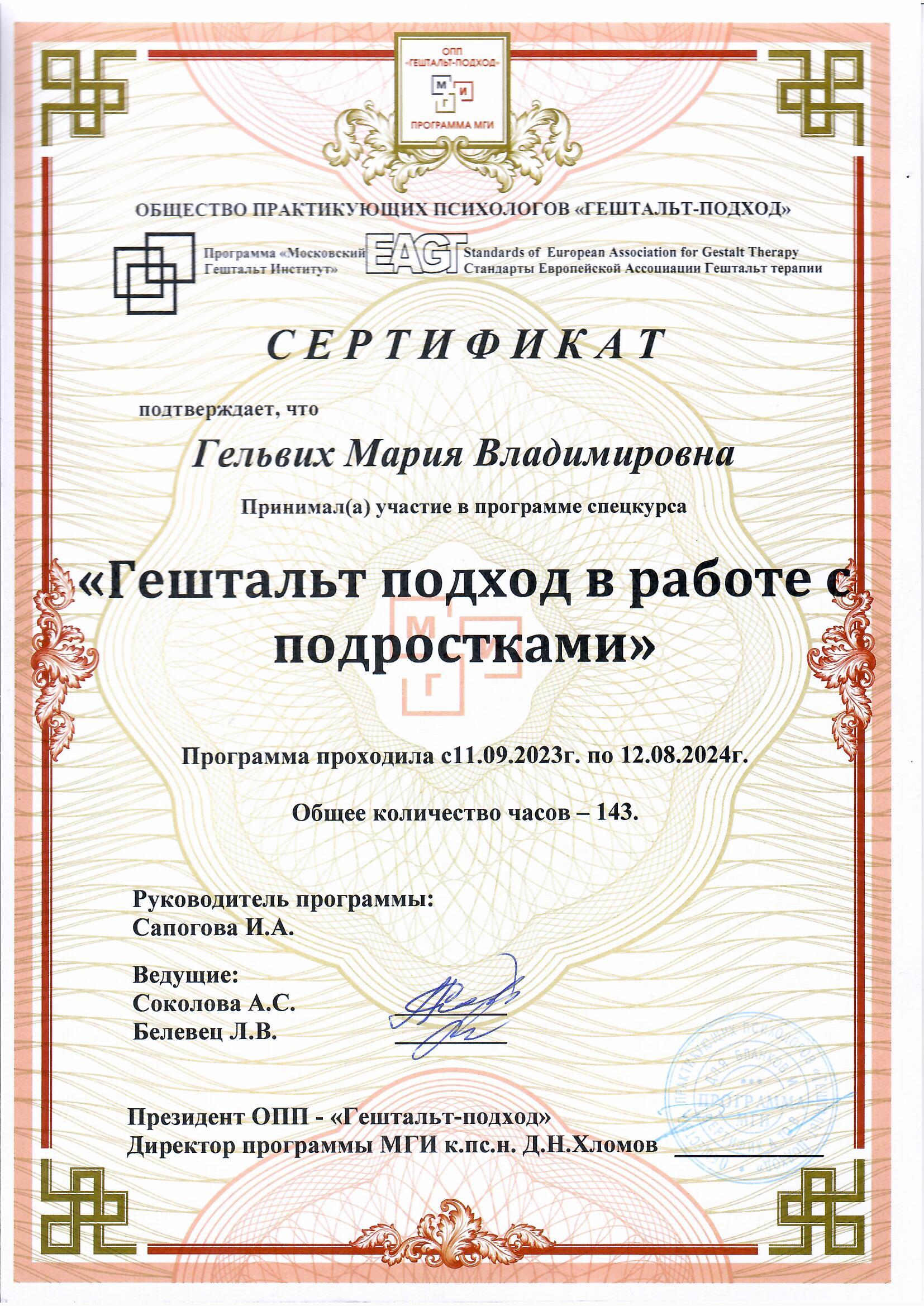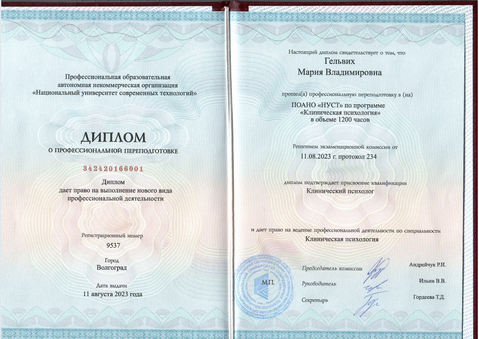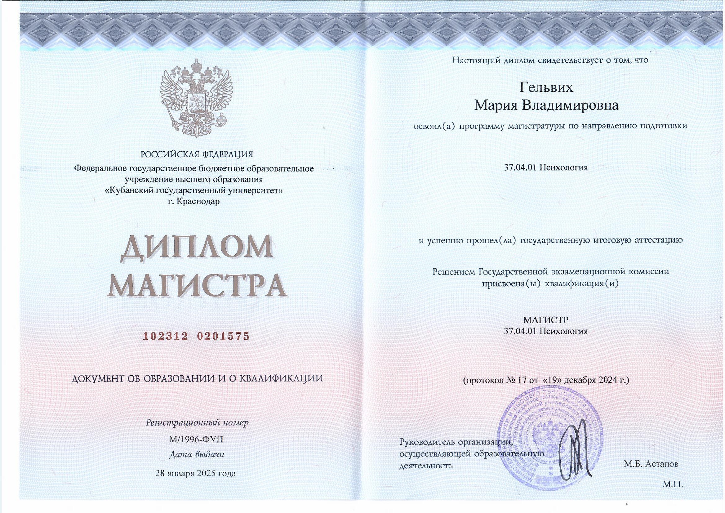 Я магистр психологии. Заканчила обучение на второй ступени Московского Гештальт Института, продолжаю развиваться профессионально. Более 200 часов личной терапии и 100 групповой, регулярная личная и групповая супервизия, имею опыт ведения психологических групп и мастерских. Сертифицирована как травматерапевт и подростковый терапевт. В психологии с 2019 года, активно практикую, состою в волонтерской психологической службе Кубанского государственного университета.