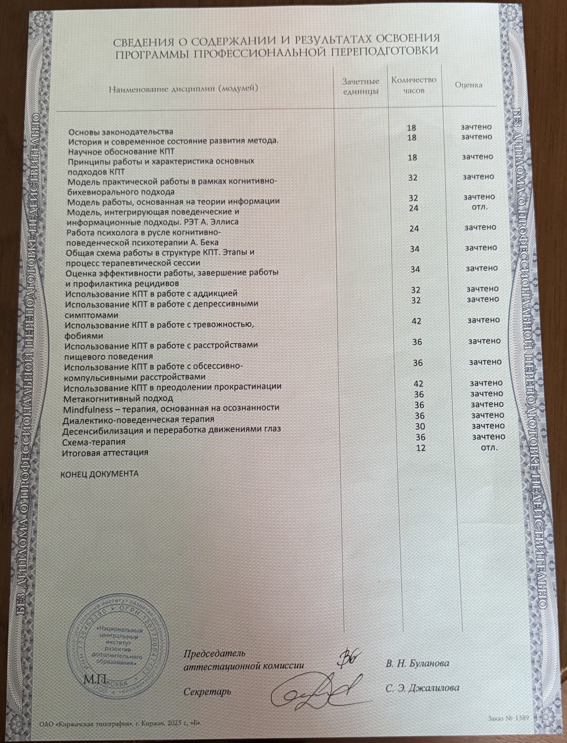 Методы работы:EMDR (ДПДГ) Арт-терапия Гештальт-терапия Диалектическая поведенческая терапия (DBT) Интегративный (смешанный) подход Когнитивно-поведенческая (КПТ) Нейролингвистическое программирование (НЛП) Рационально-эмоционально-поведенческая терапия (РЭПТ) Символдрама Системная семейная психотерапия Схема-терапия Транзактный анализ Эмоционально-образная терапия (ЭОТ) телесно ориентированная терапия