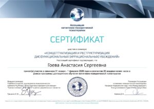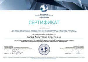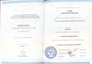 - Закончила программу «Клиническая психология. Когнитивно-поведенческие технологии в психотерапии и консультировании» в Институте психотерапии и клинической психологии. Специализация по расстройствам пищевого поведения — программа «Особенности и практика комплексной и психологической коррекции клиентов с РПП» в Школе Эмоционального Интеллекта и Психотерапии.