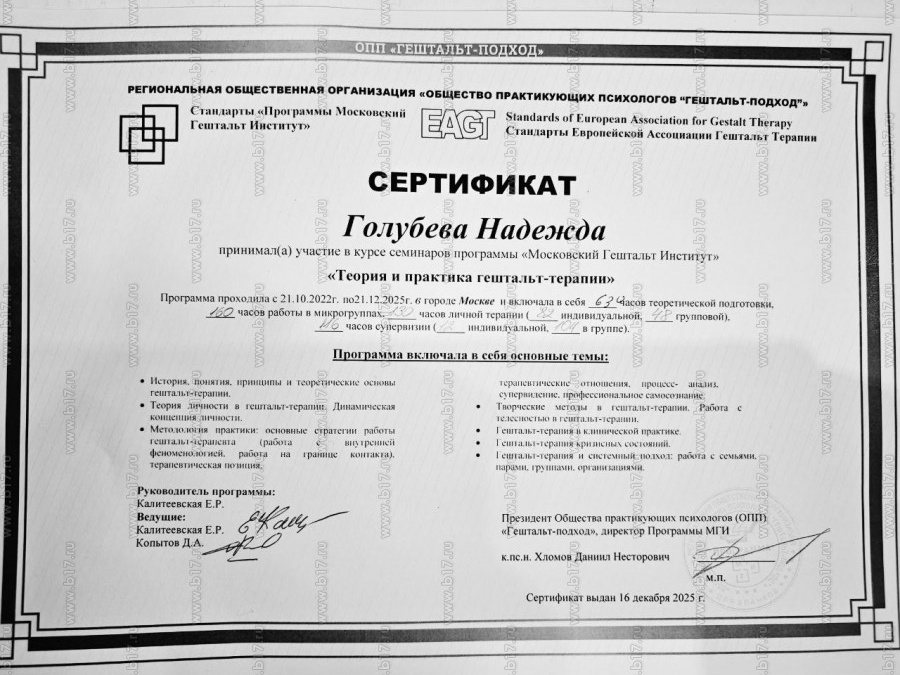 Методы работы:Гештальт-терапия Когнитивно-поведенческая (КПТ) телесно ориентированная терапия