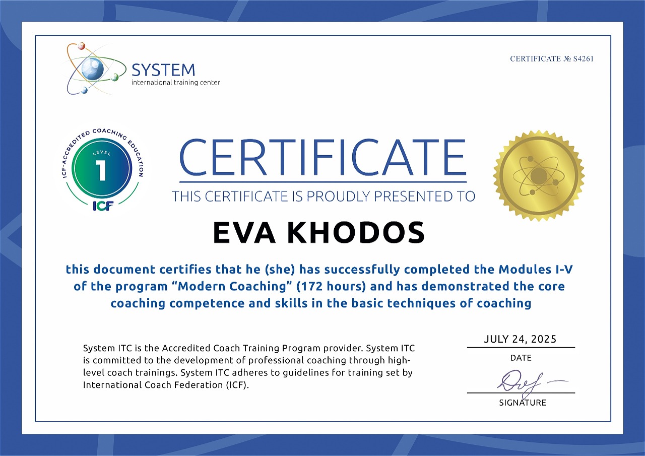 Меня зовут Ева, я практкующий психолог, магистр психологии, коуч ICF.