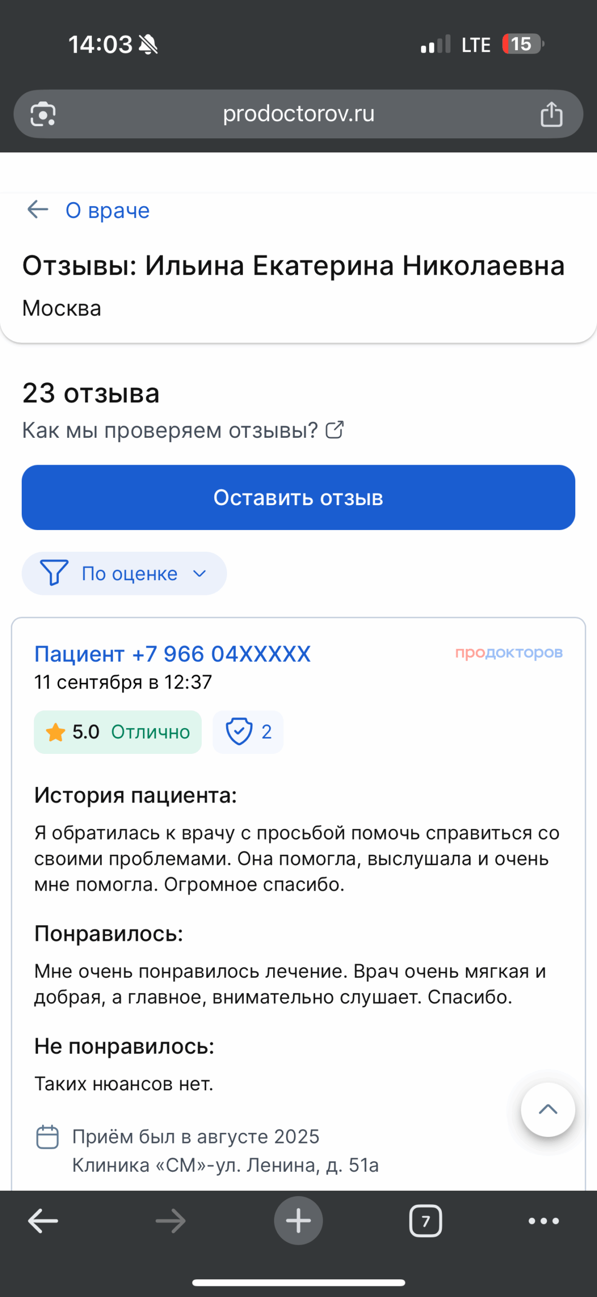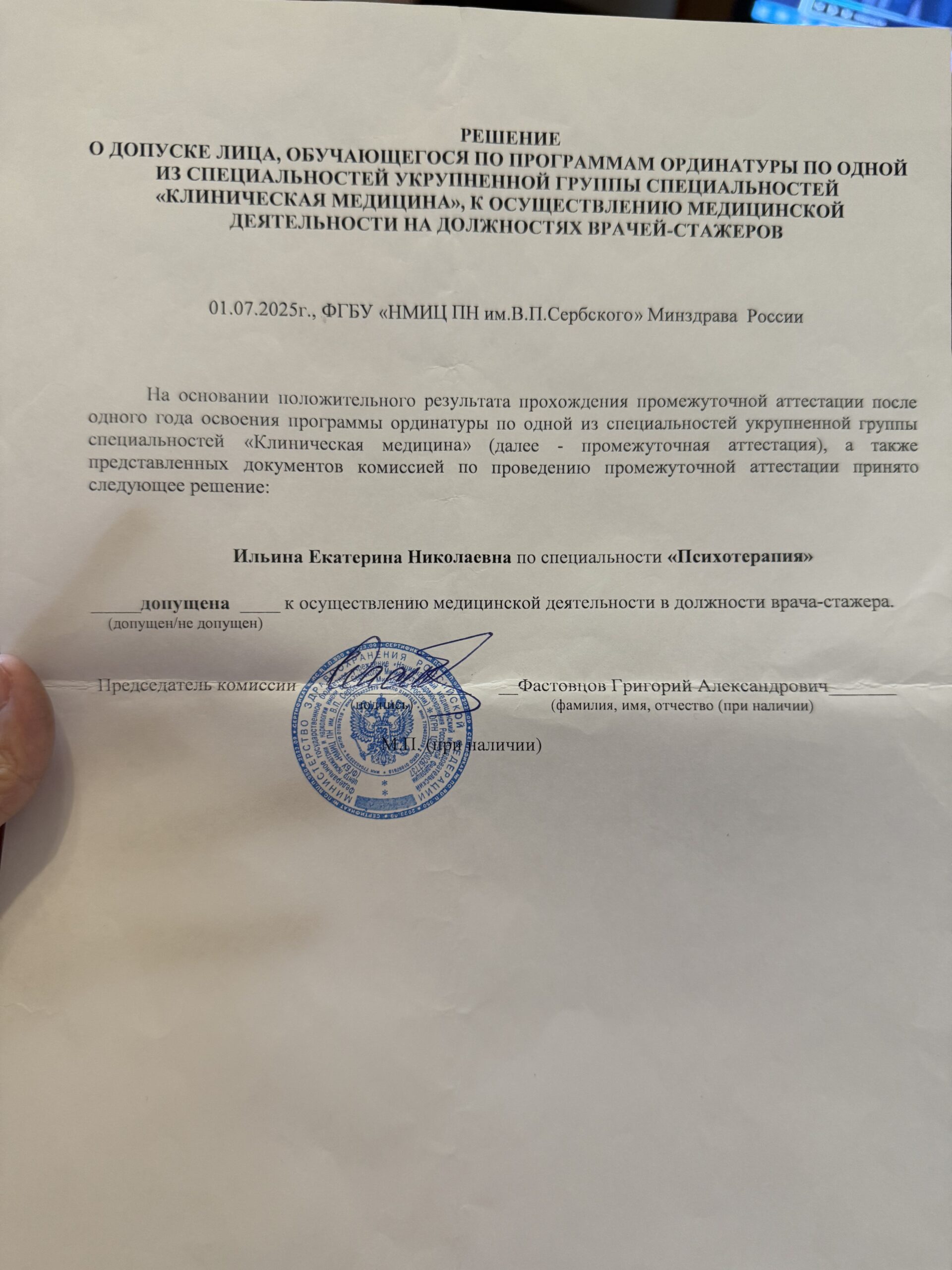 Я врач-ординатор НМИЦ им.Сербского по специальности «психотерапия». С августа 2025 года работаю врачом-стажером психотерапевтом в клинико-реабилитационном центре в отделении психосоциальной реабилитации👩⚕️
