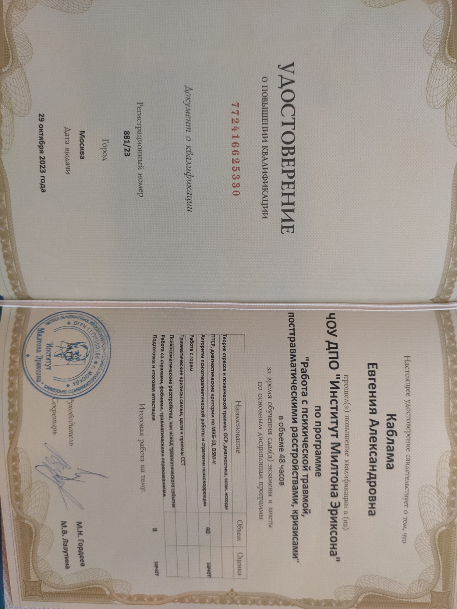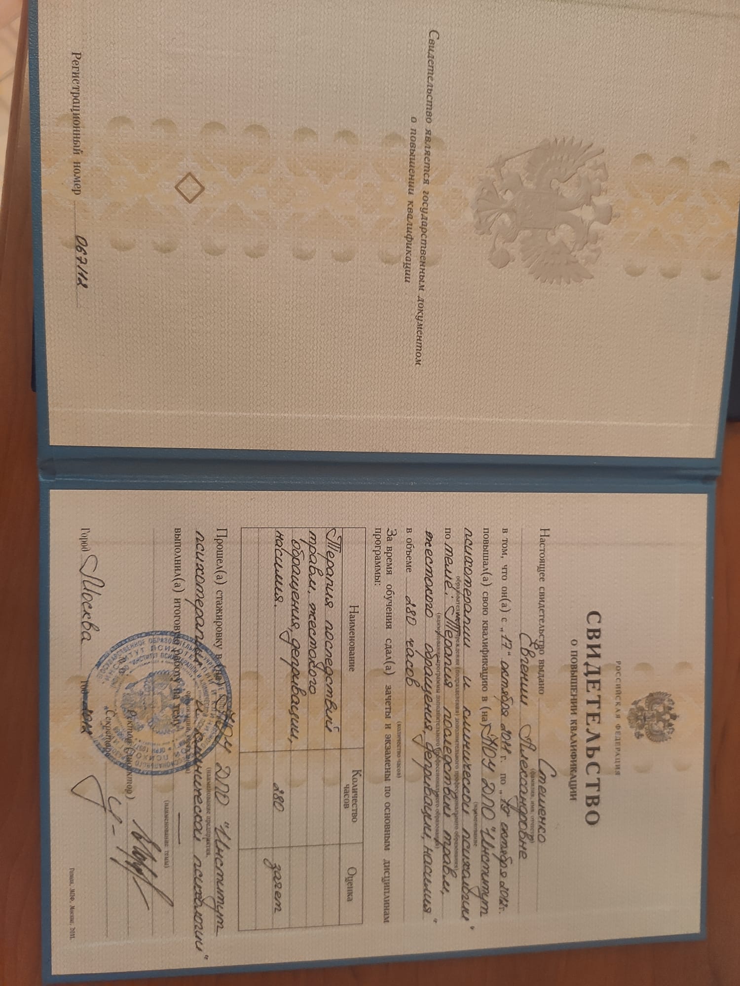 Я телесно-ориентированный психолог с медицинским образованием, травматерапевт с опытом личной терапии и супервизии (более 250 часов ) и опытом работы более 20 лет.