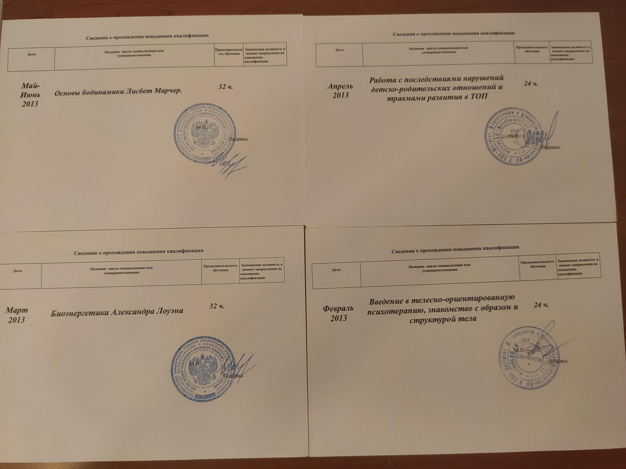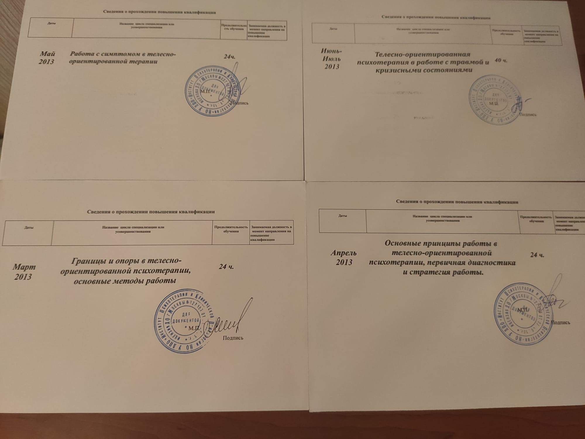 В своей работе использую эффективные техники телесно-ориентированной терапии в сочетании с другими направлениями: метод работы с травмой, последствиями насилия и депривации профессора М.Мюррей, США; арт-терапия, КПТ, психоанализ.