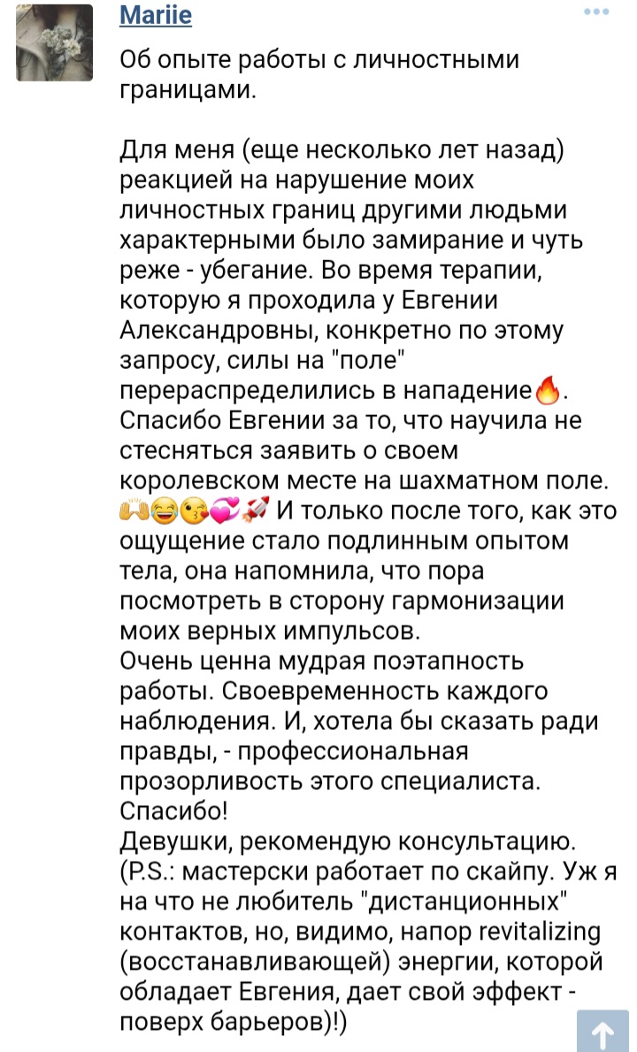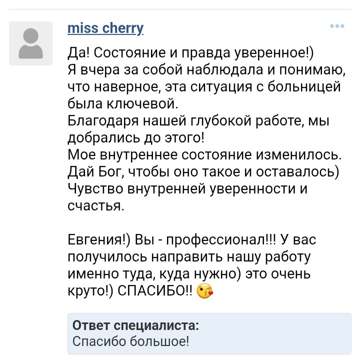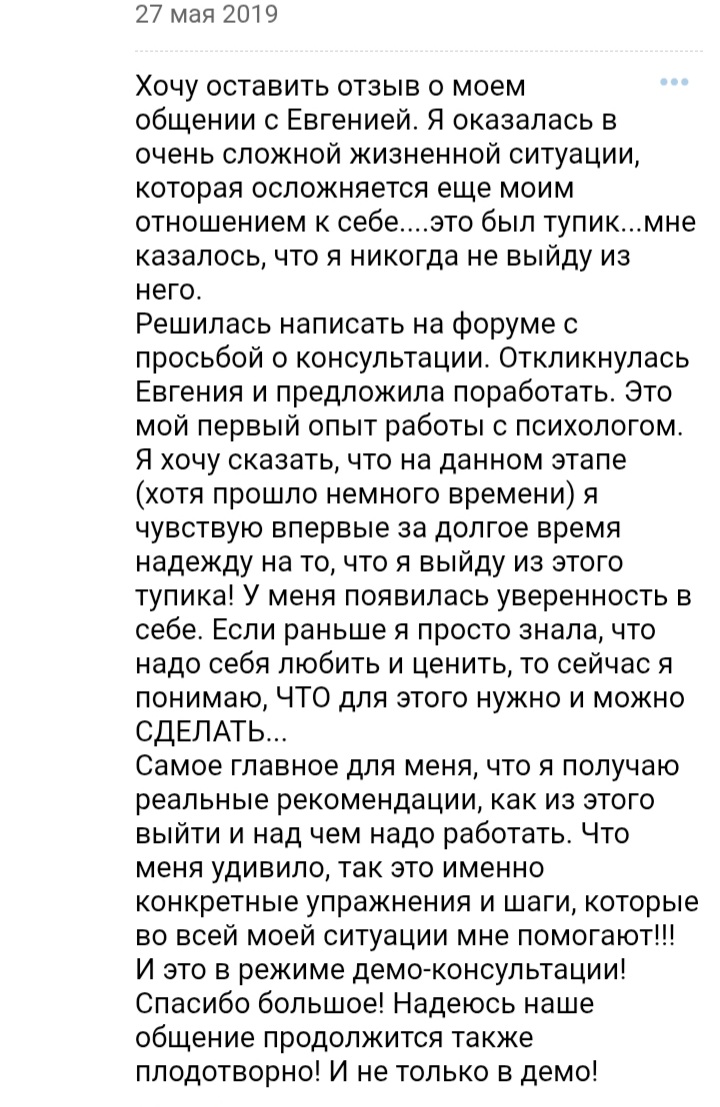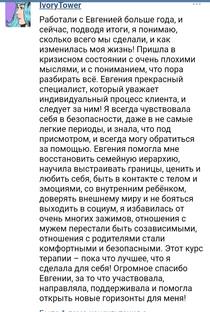 В таких случаях важно не откладывать обращение за помощью, ведь в психологии, как и в медицине, если не лечить болезнь, то симптомы усугубляются. И наоборот, чем раньше начнется процесс терапии,тем быстрее и легче будет восстановление.