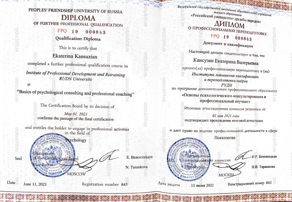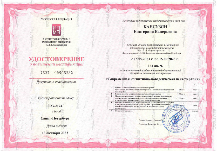 Подход, в котором я работаю: когнитивно-поведенческая терапия. Прохожу регулярную супервизию и личную терапию, повышения квалификации.