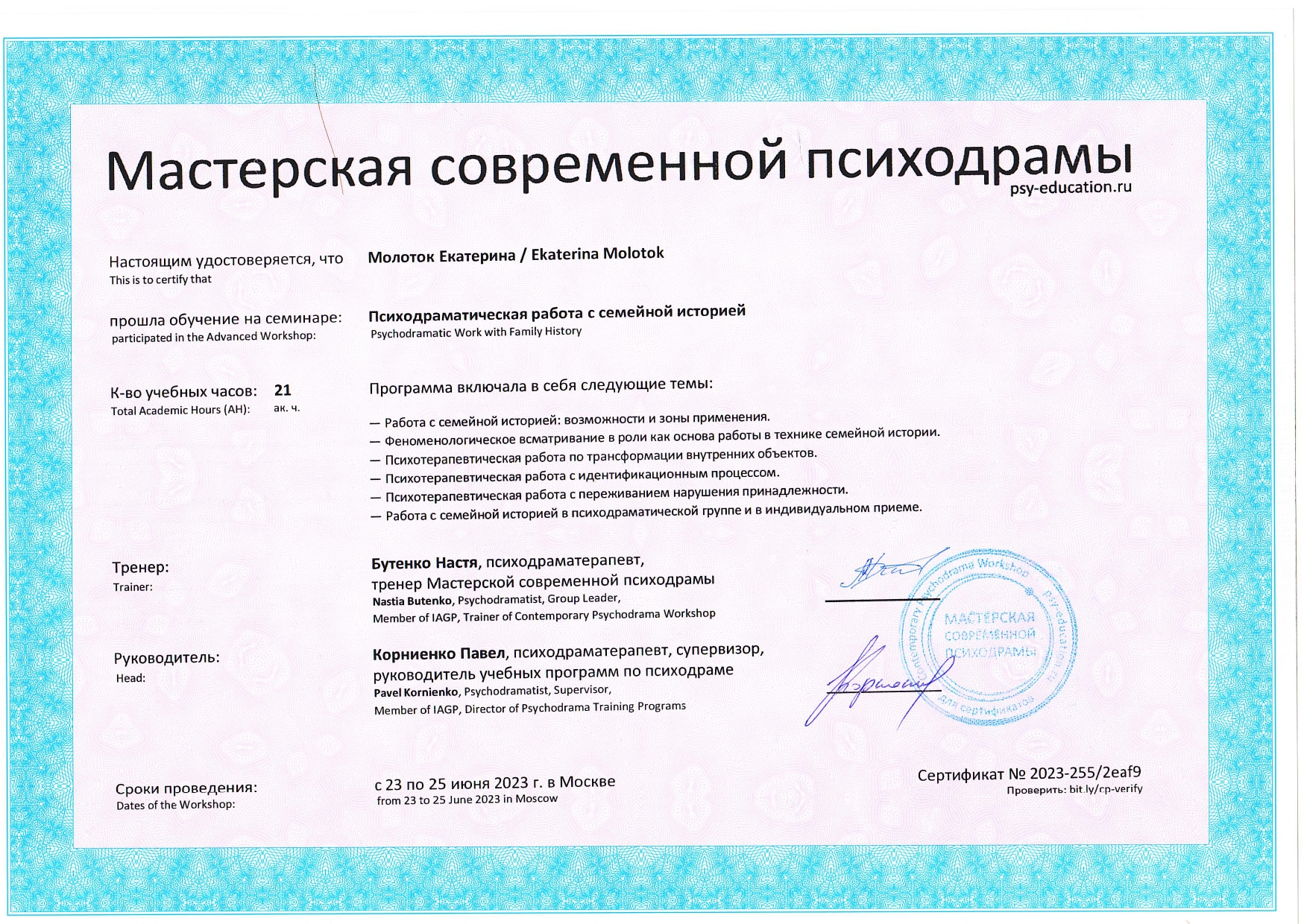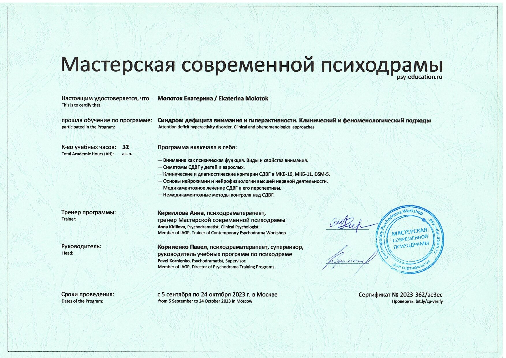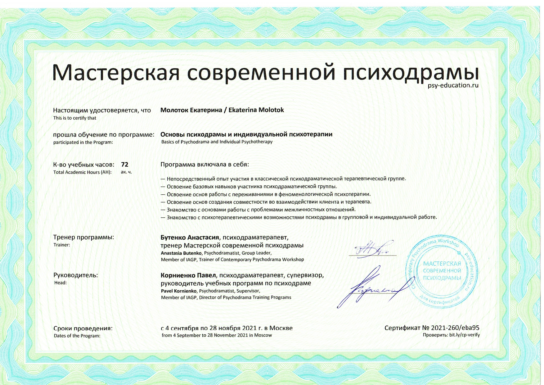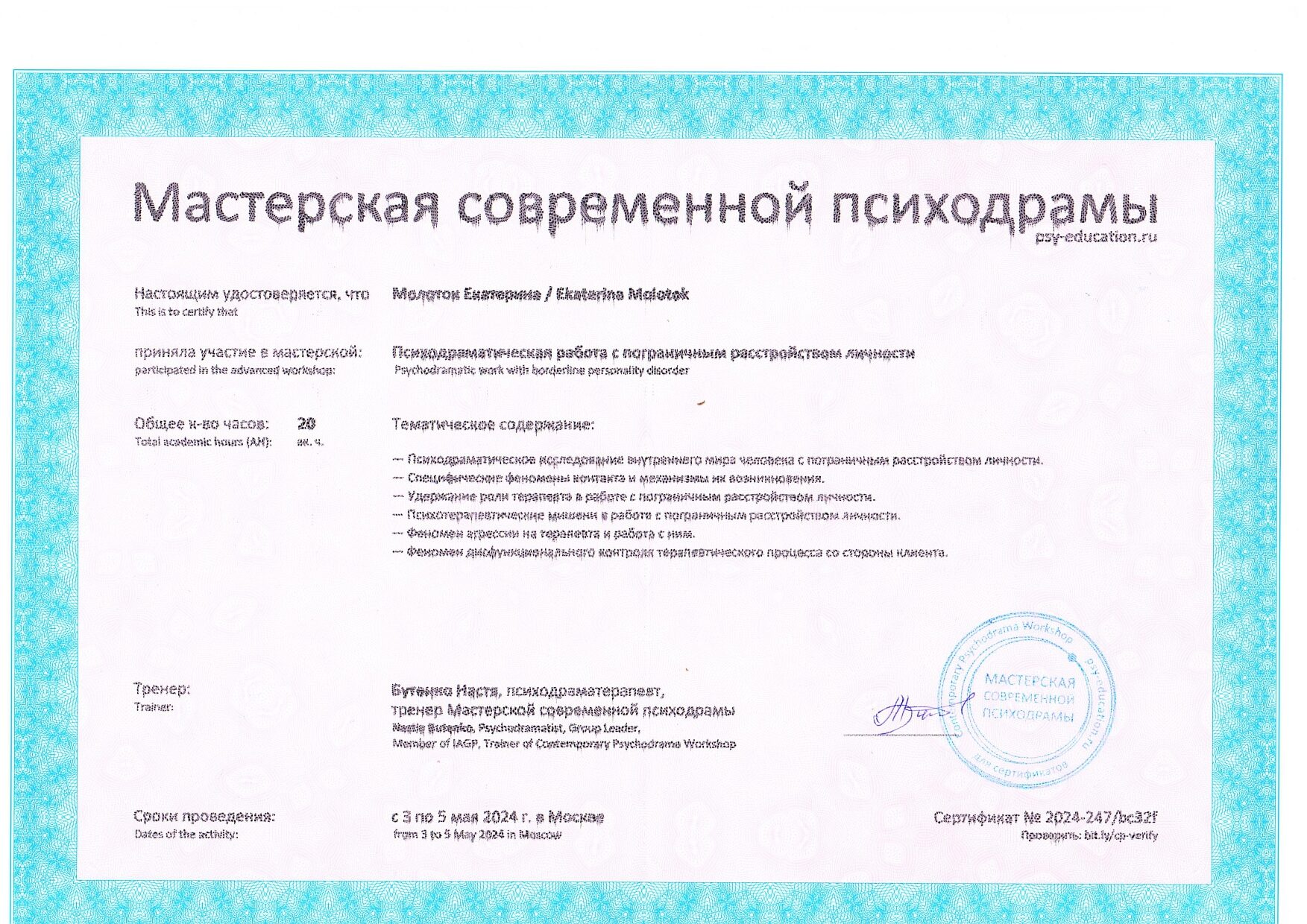 Также училась схема-терапии и КПТ, но мой основной подход - феноменология и психодрама. Тем не менее, я могу интегрировать инструменты из перечисленных подходов в свою работу при необходимости.