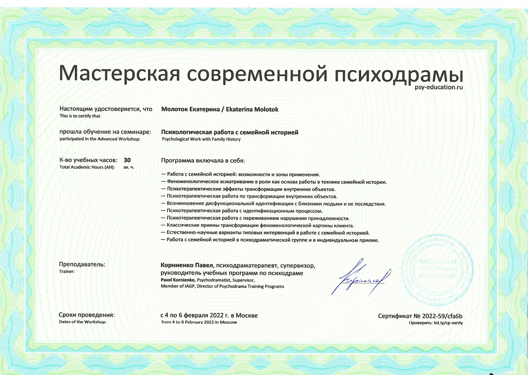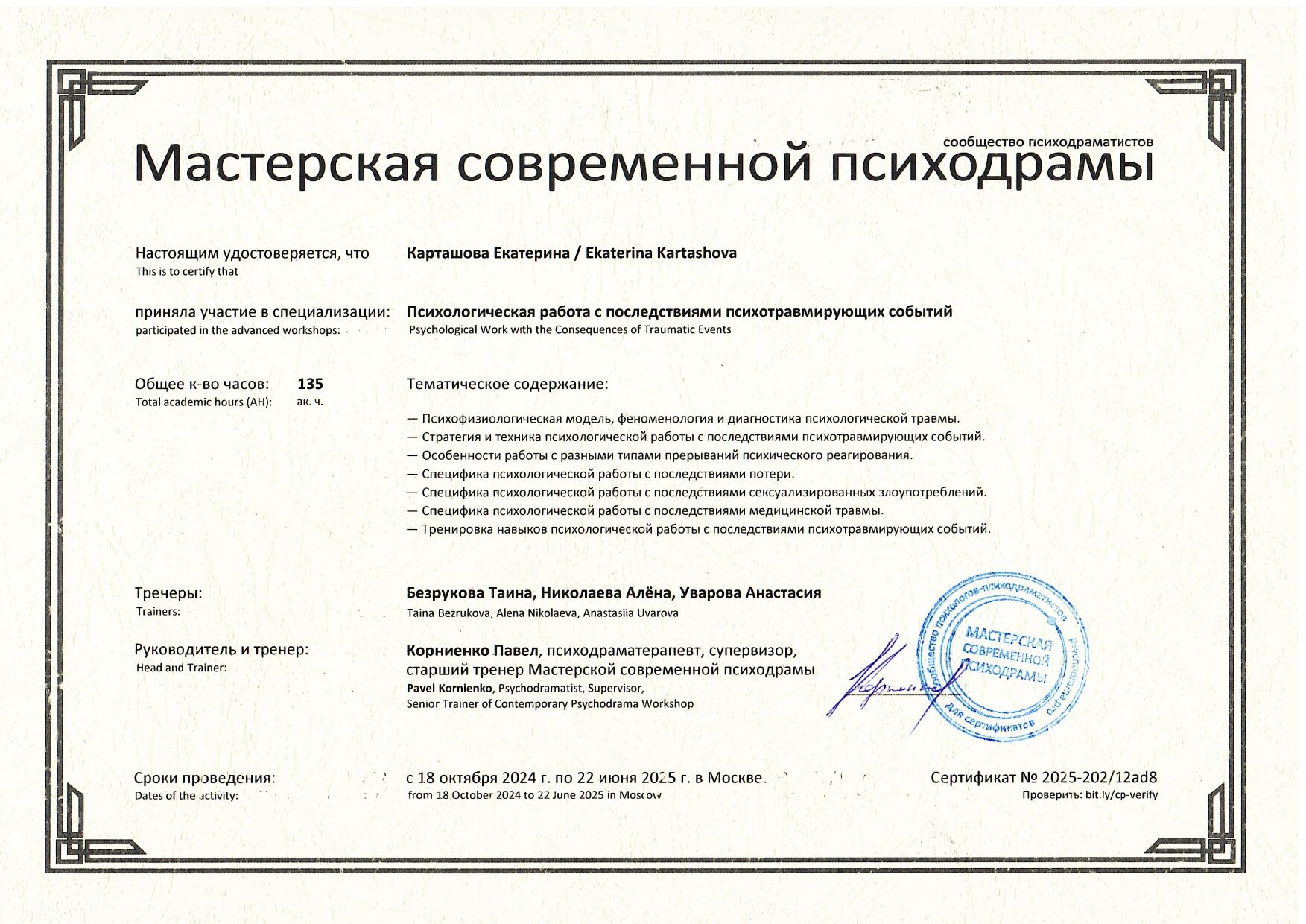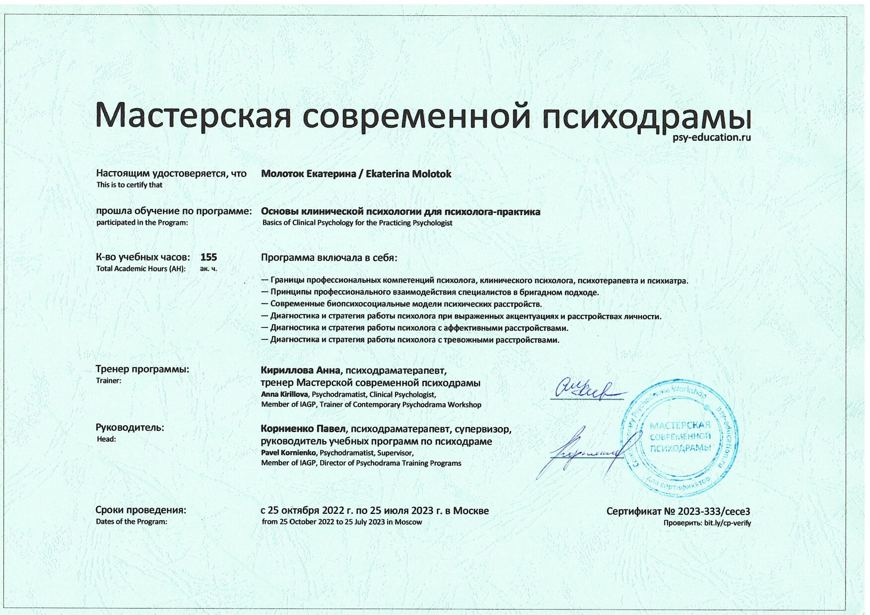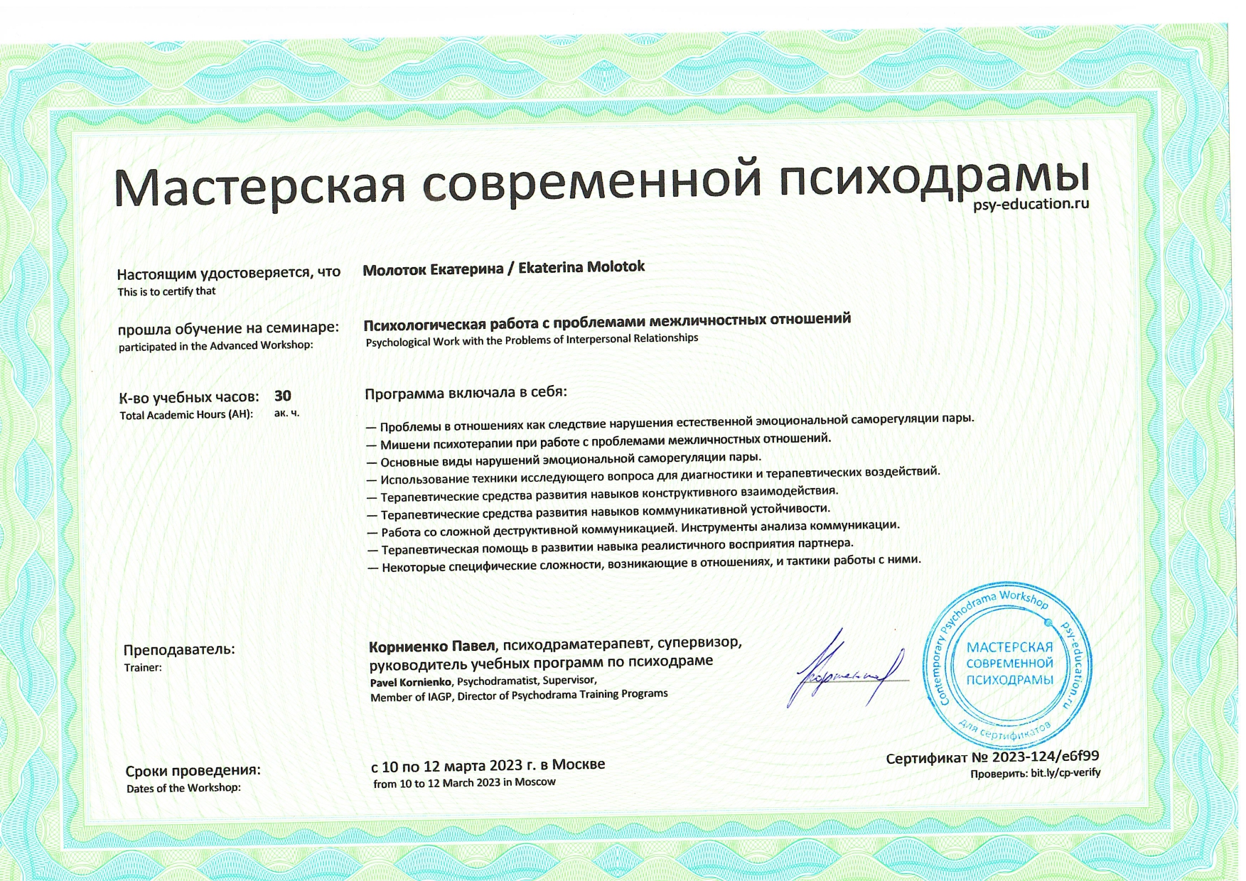Также училась схема-терапии и КПТ, но мой основной подход - феноменология и психодрама. Тем не менее, я могу интегрировать инструменты из перечисленных подходов в свою работу при необходимости.