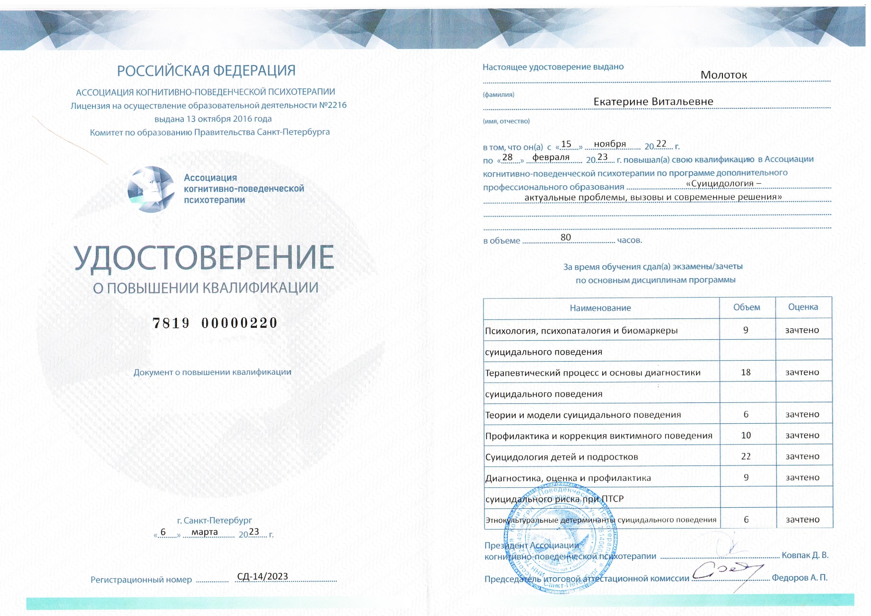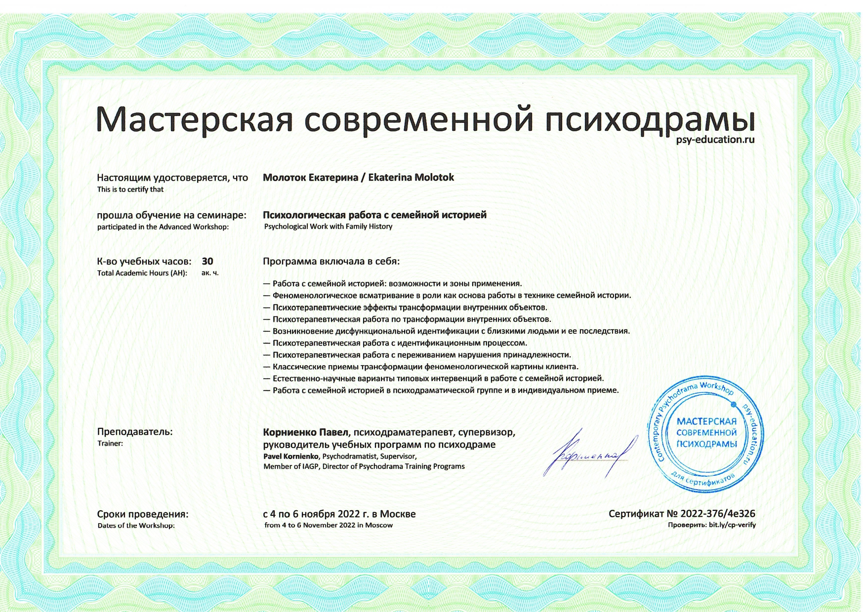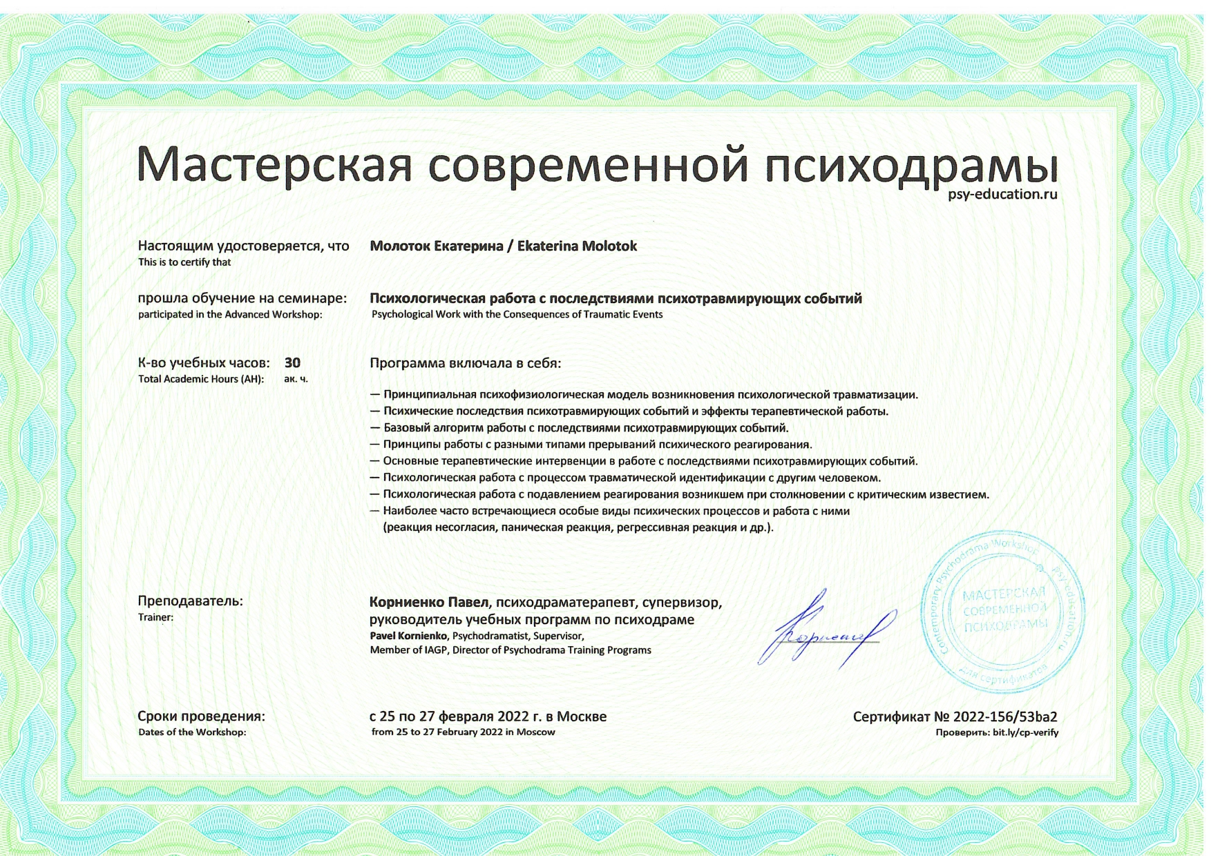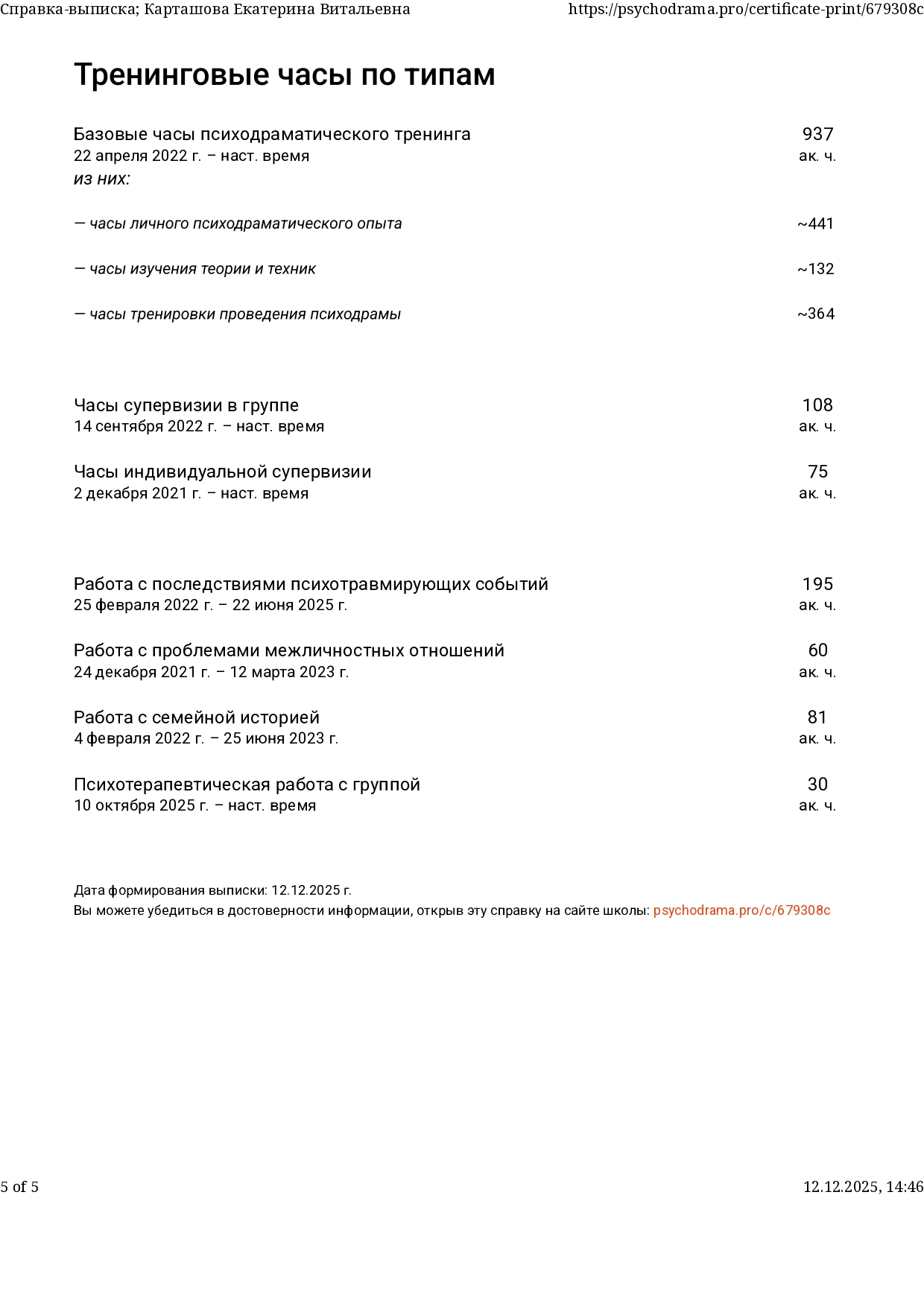 Также училась схема-терапии и КПТ, но мой основной подход - феноменология и психодрама. Тем не менее, я могу интегрировать инструменты из перечисленных подходов в свою работу при необходимости.