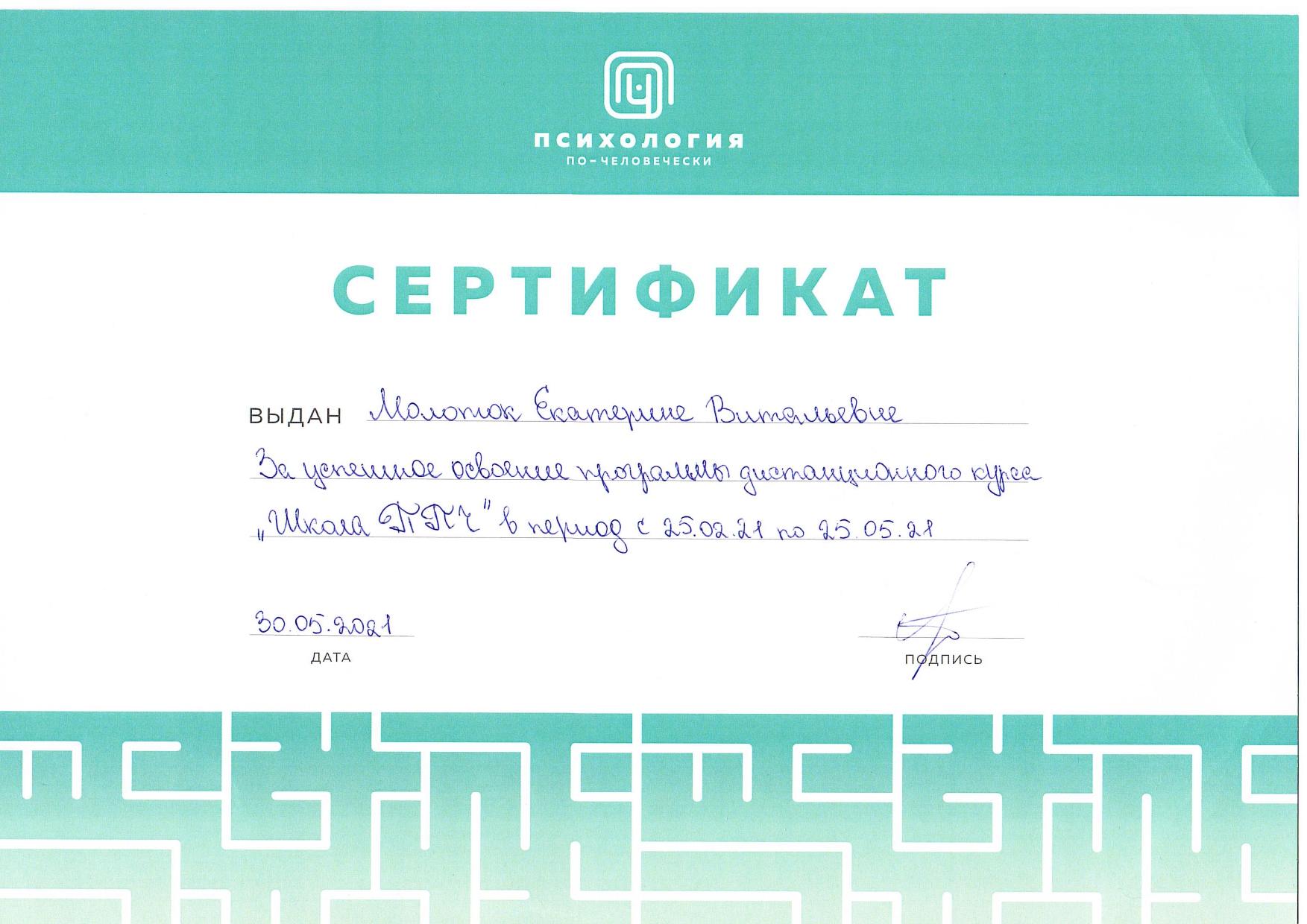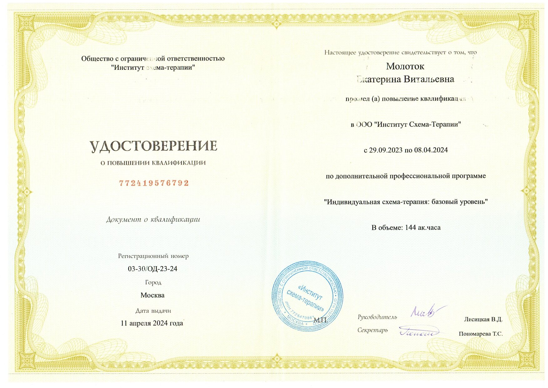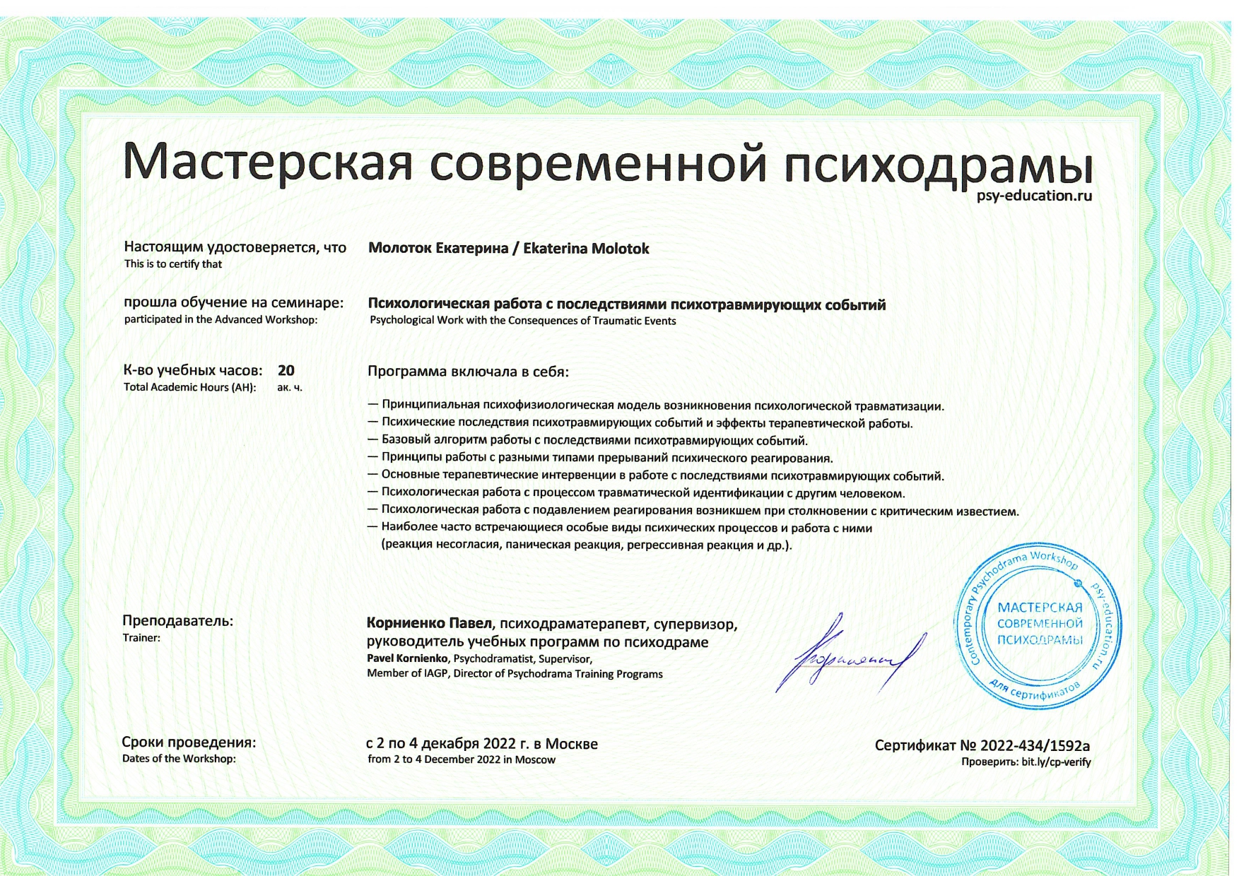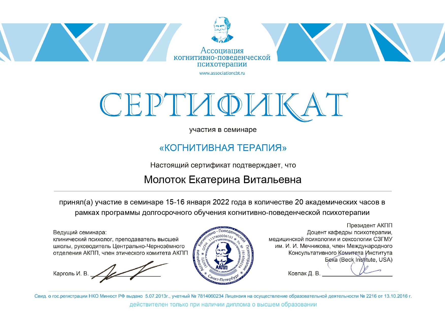 Также училась схема-терапии и КПТ, но мой основной подход - феноменология и психодрама. Тем не менее, я могу интегрировать инструменты из перечисленных подходов в свою работу при необходимости.