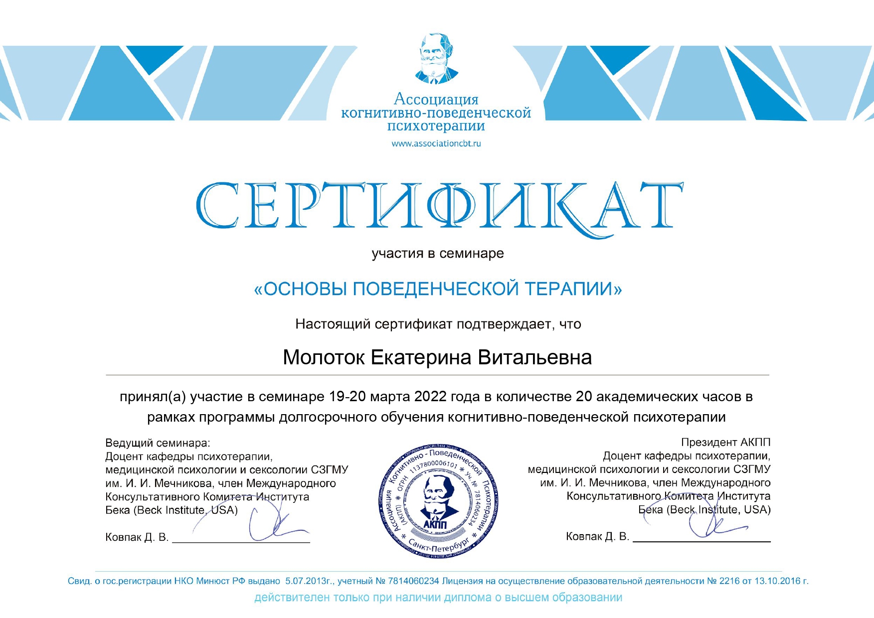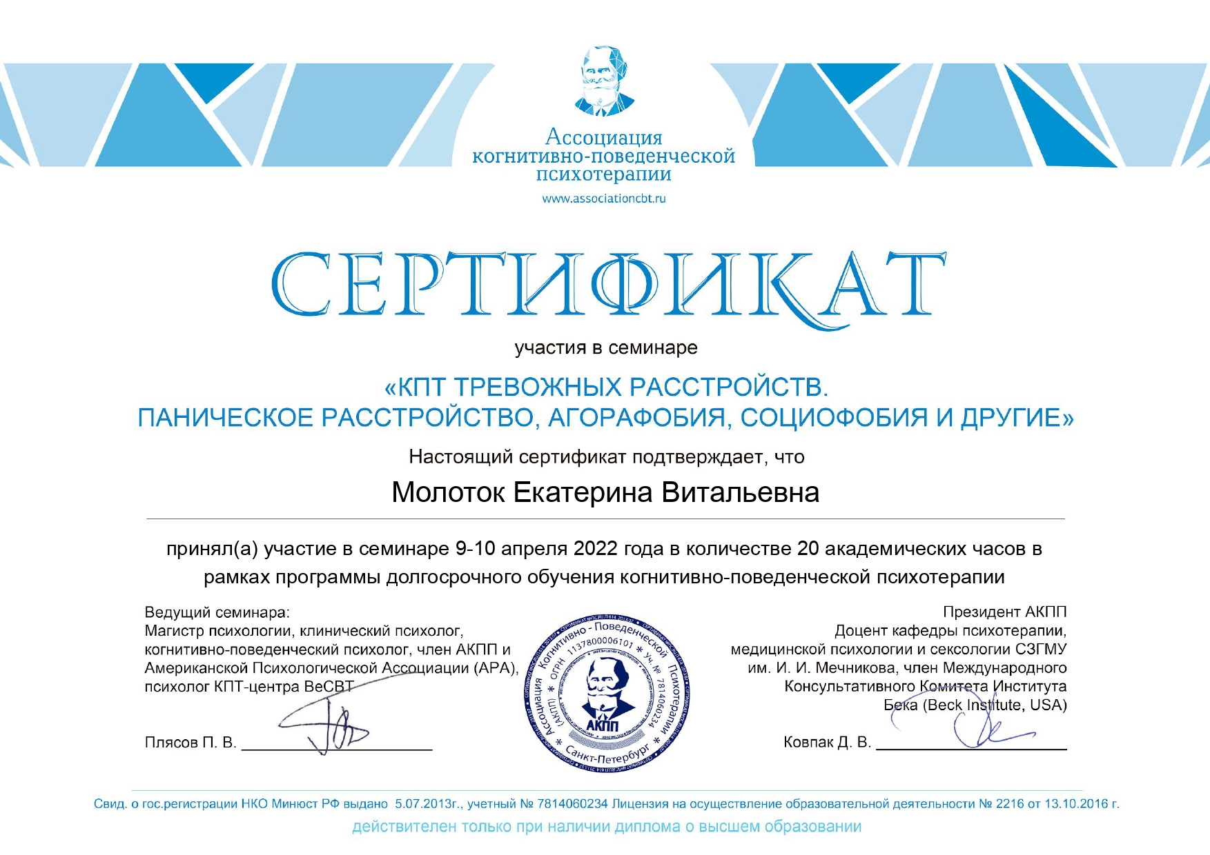 Клиническое образование позволяет мне принимать клиентов с психиатрическими диагнозами: аффективные расстройства, тревожные расстройства, расстройства личности, СДВГ, ПТСР и кПТСР.