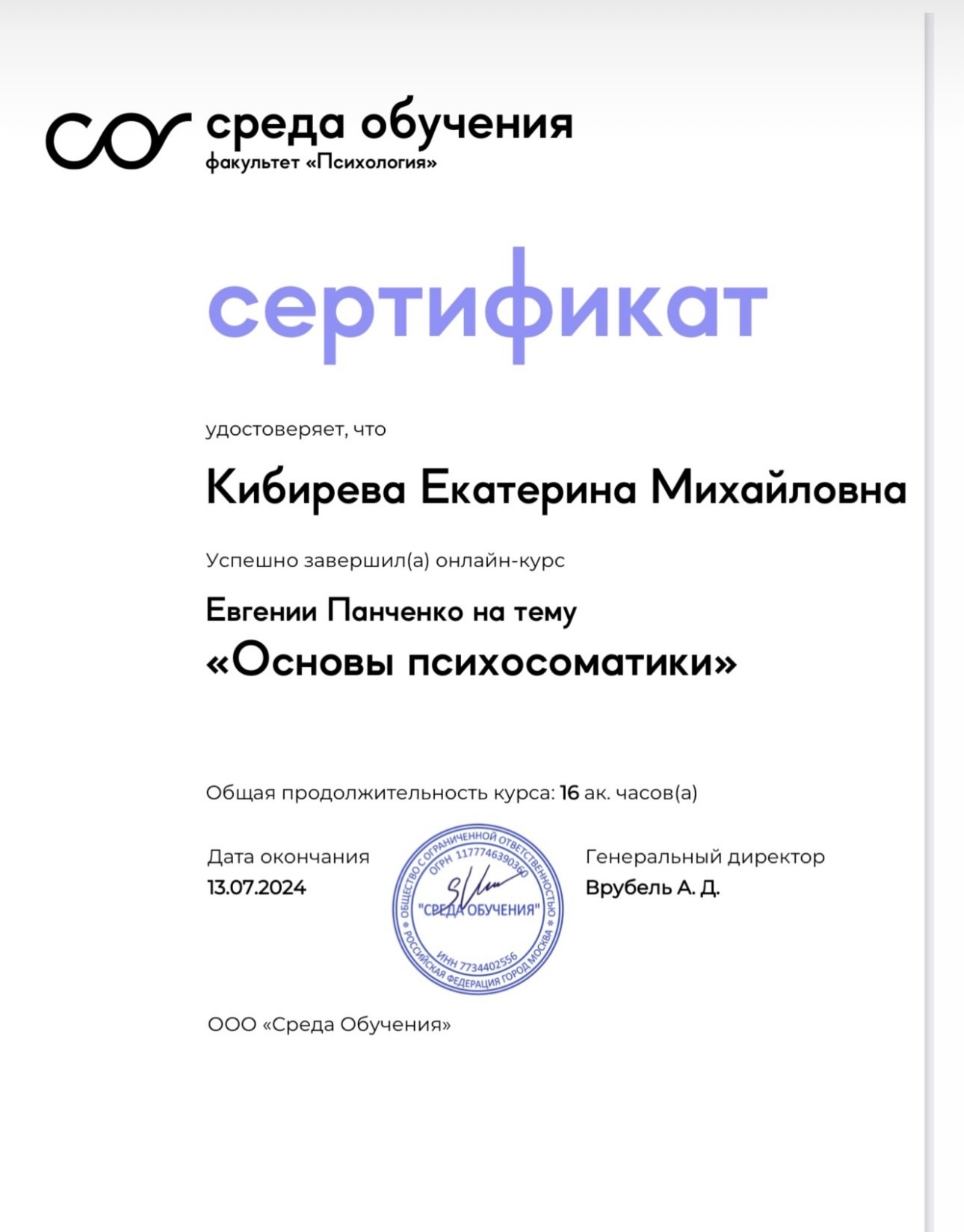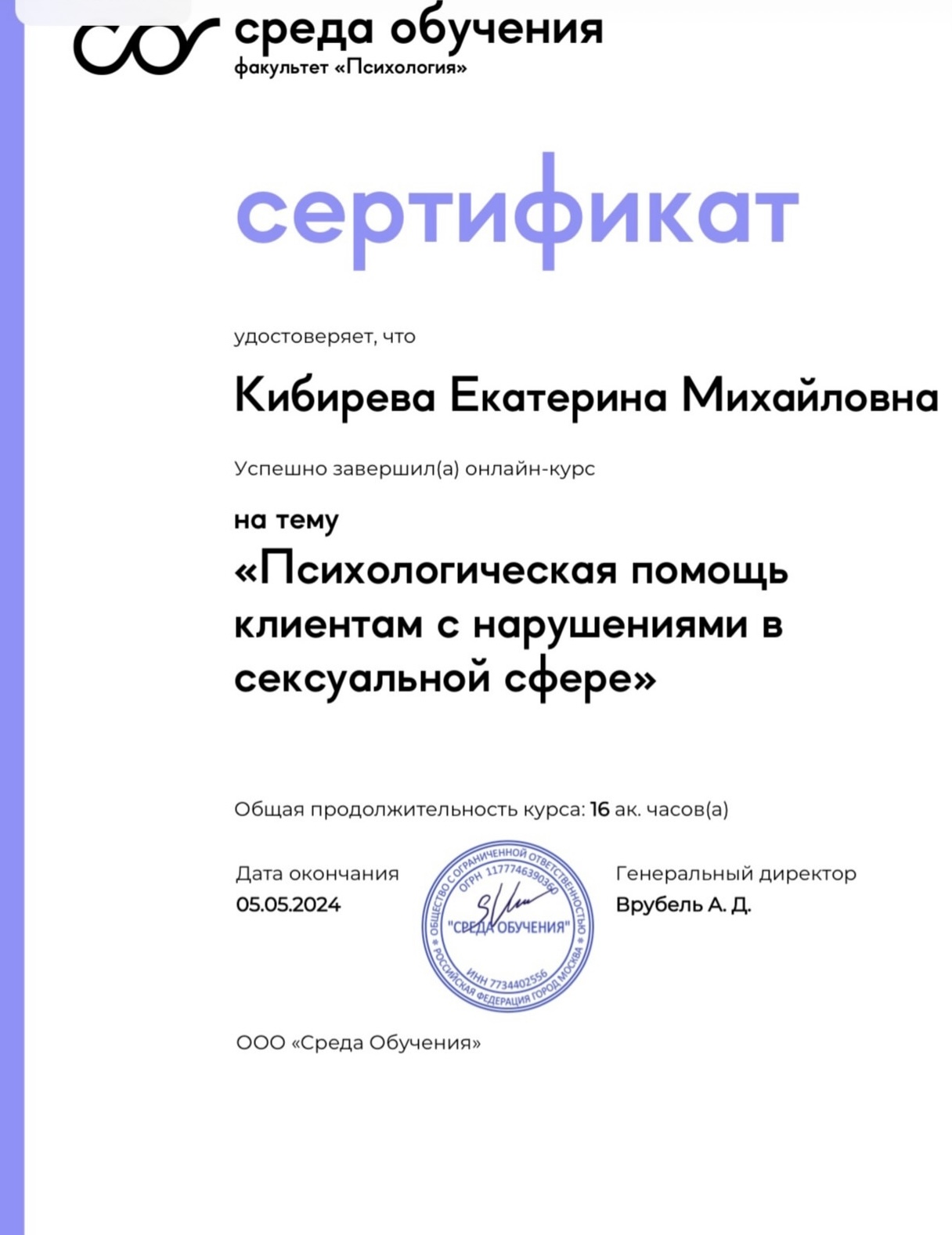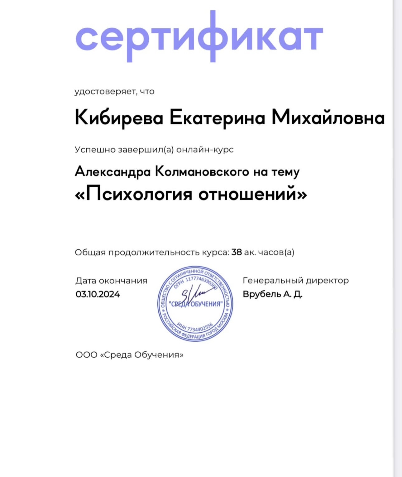 Здравствуйте! Меня зовут Екатерина Кибирева. Я дипломированный психолог-консультант и терапевт, работающий в краткосрочном подходе, ориентированном на решение(ОРКТ)