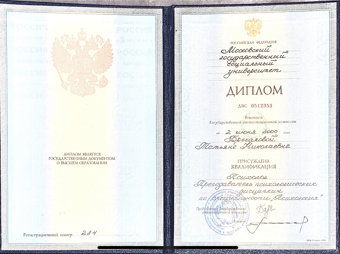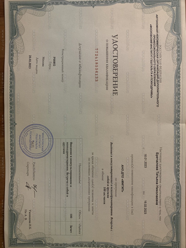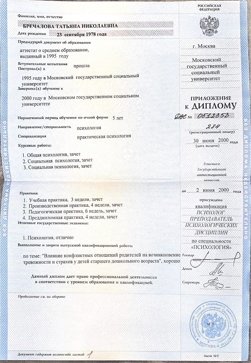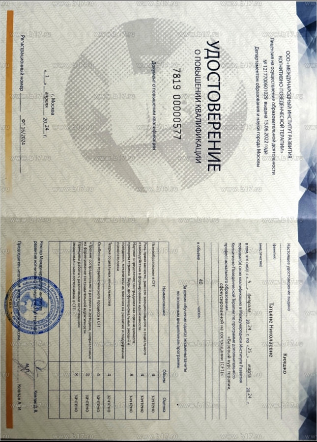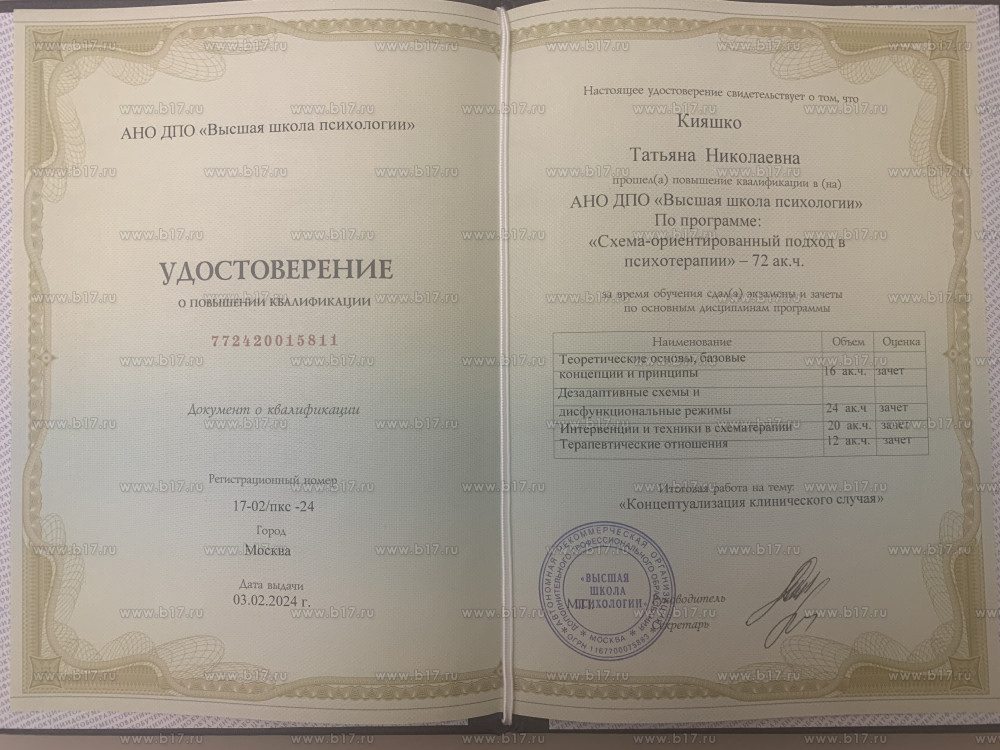 Образование: высшее психологическое образование, дополнительное образование по «Схема-терапия» (сертифицированный курс ВШП (Касьяник П.М.) + курс АКПП),«Когнитивно-поведенческая терапия», «Психодрама», участие в конференциях