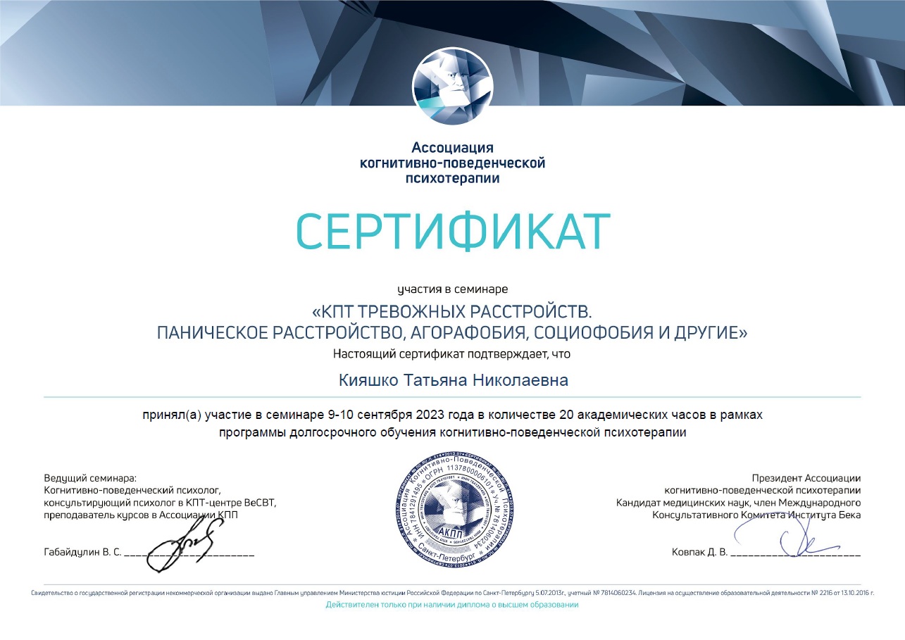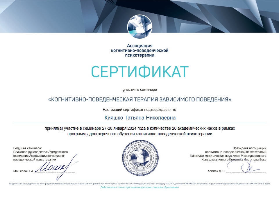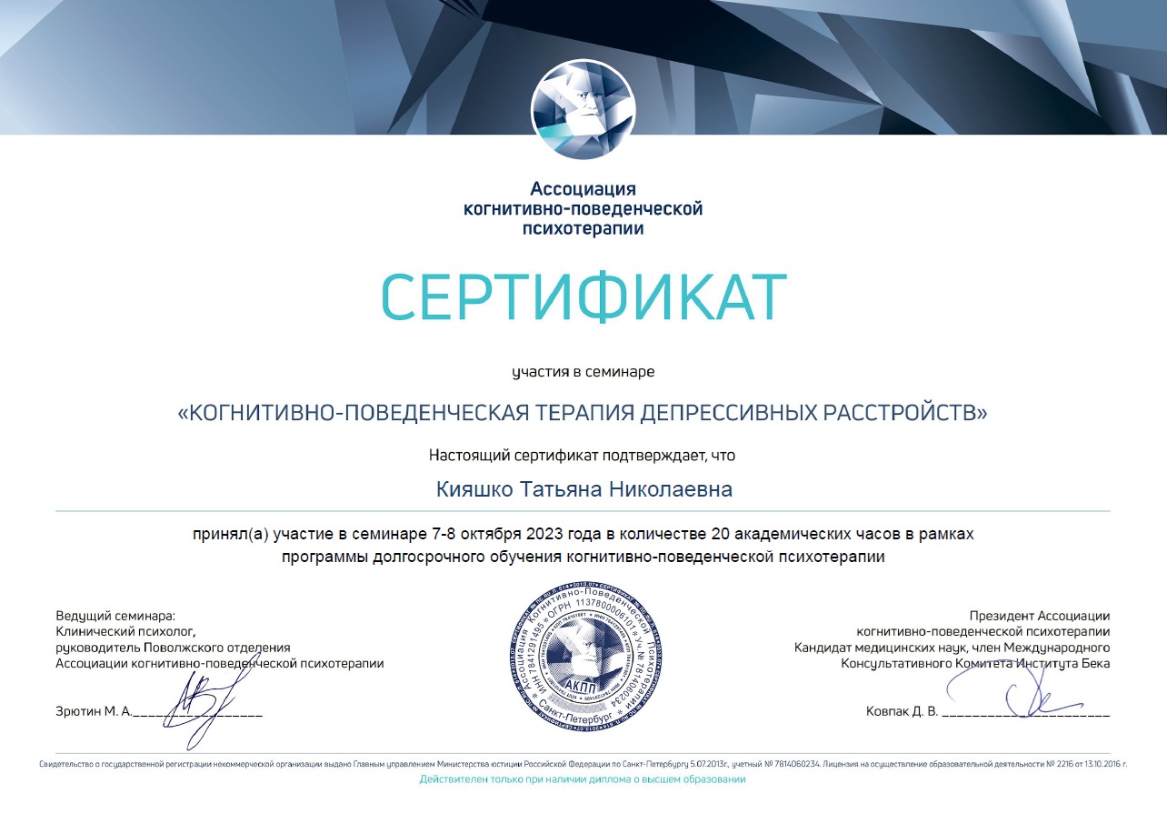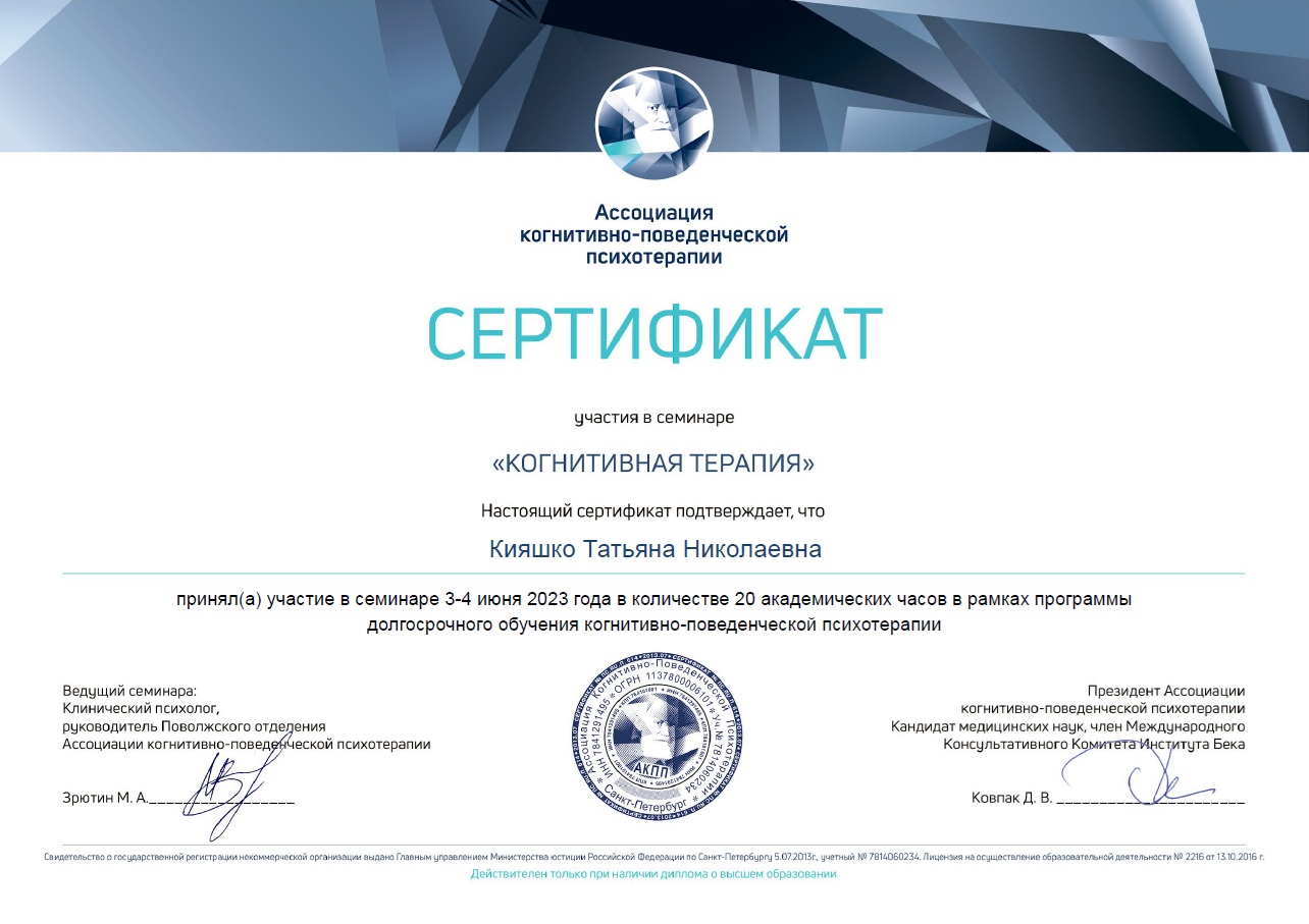 Член Ассоциации когнитивно-поведенческой психотерапии (АКПП)