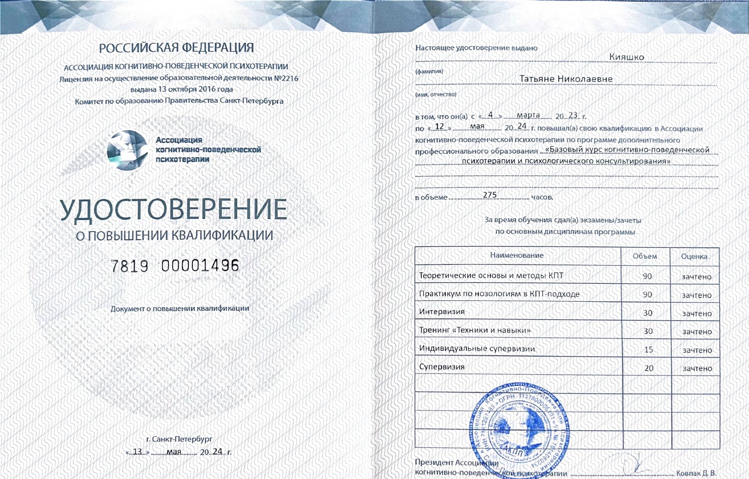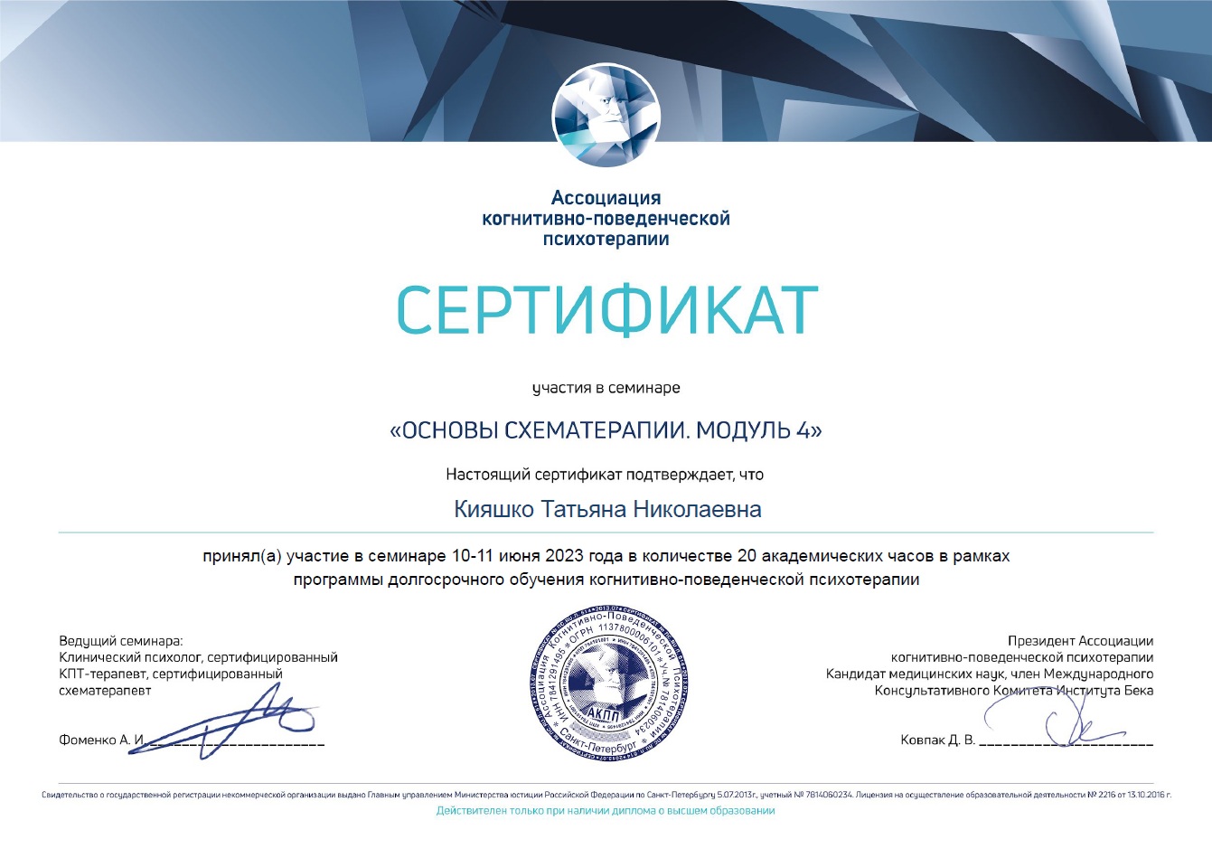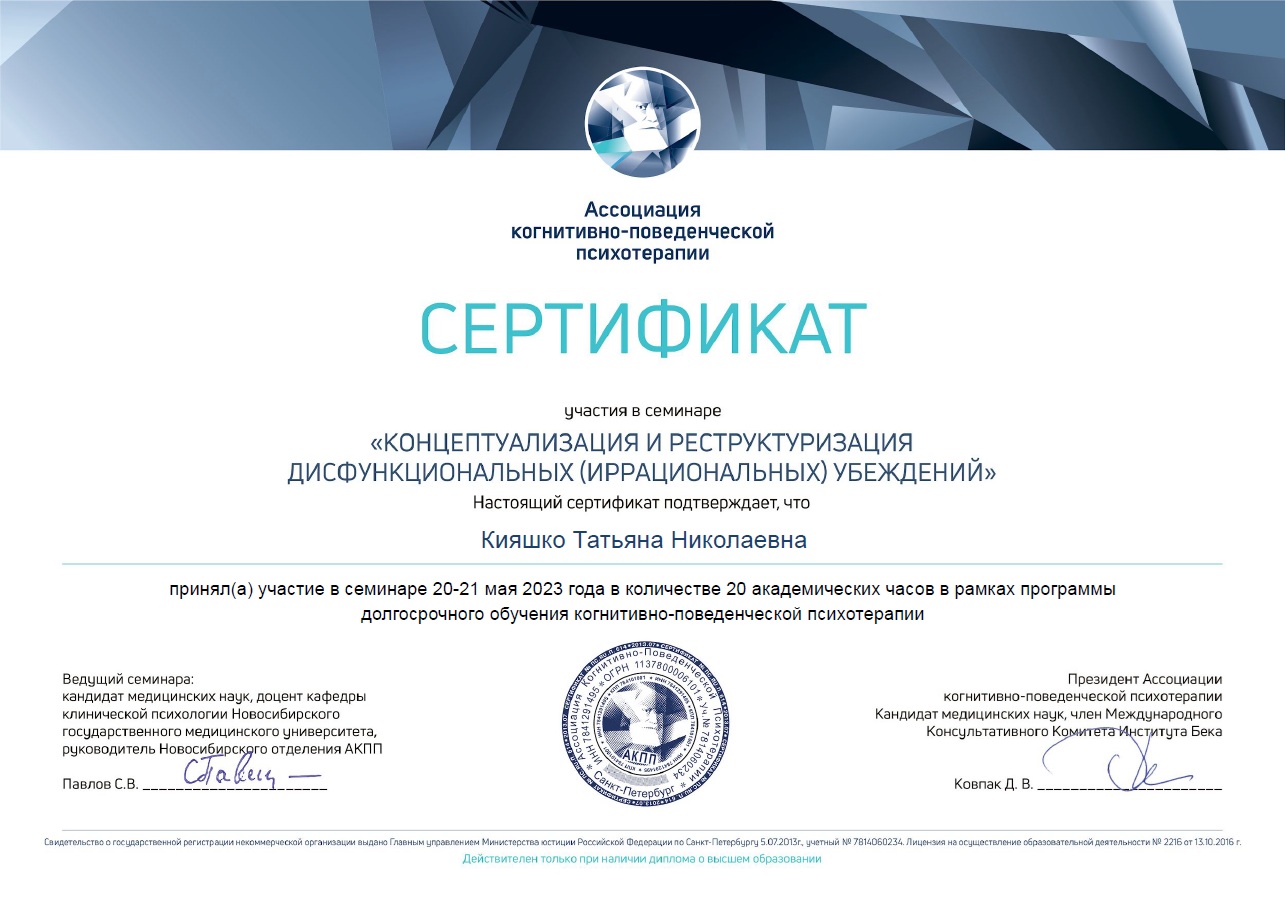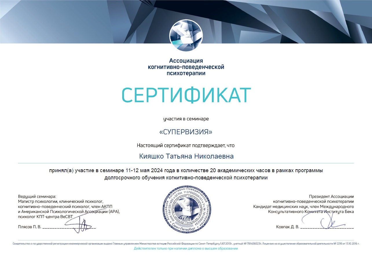 Член Ассоциации когнитивно-поведенческой психотерапии (АКПП)