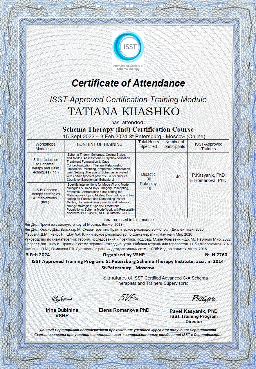 Член Международного Общества Схема-терапии (International Society of Schema Therapy, ISST)