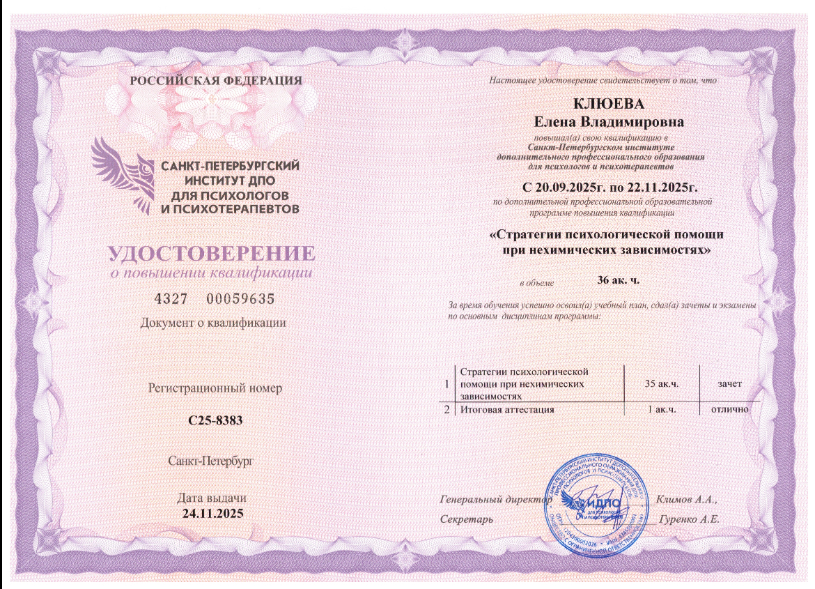 Я ценю время своих клиентов, поэтому уже несколько лет активно изучаю методы краткосрочной терапии, в том числе у западных коллег. Что позволяет моим клиентам оперативно решать их запросы различной сложности без погружения в неприятные чувства.
