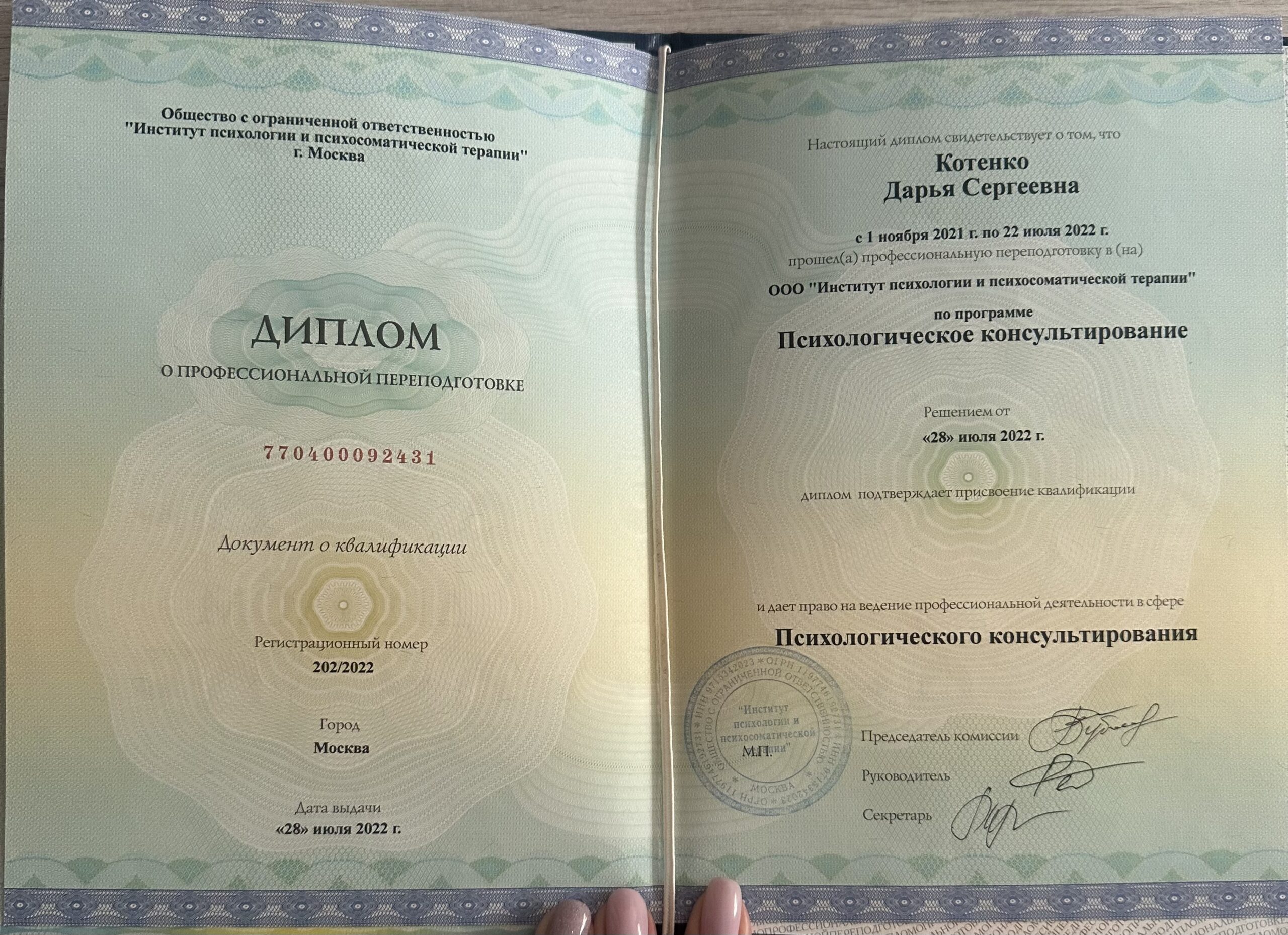 Я дипломированный психолог, состою в общероссийской профессиональной психотерапевтической лиге (ОППЛ). Регулярно посещаю личную терапию и супервизию.