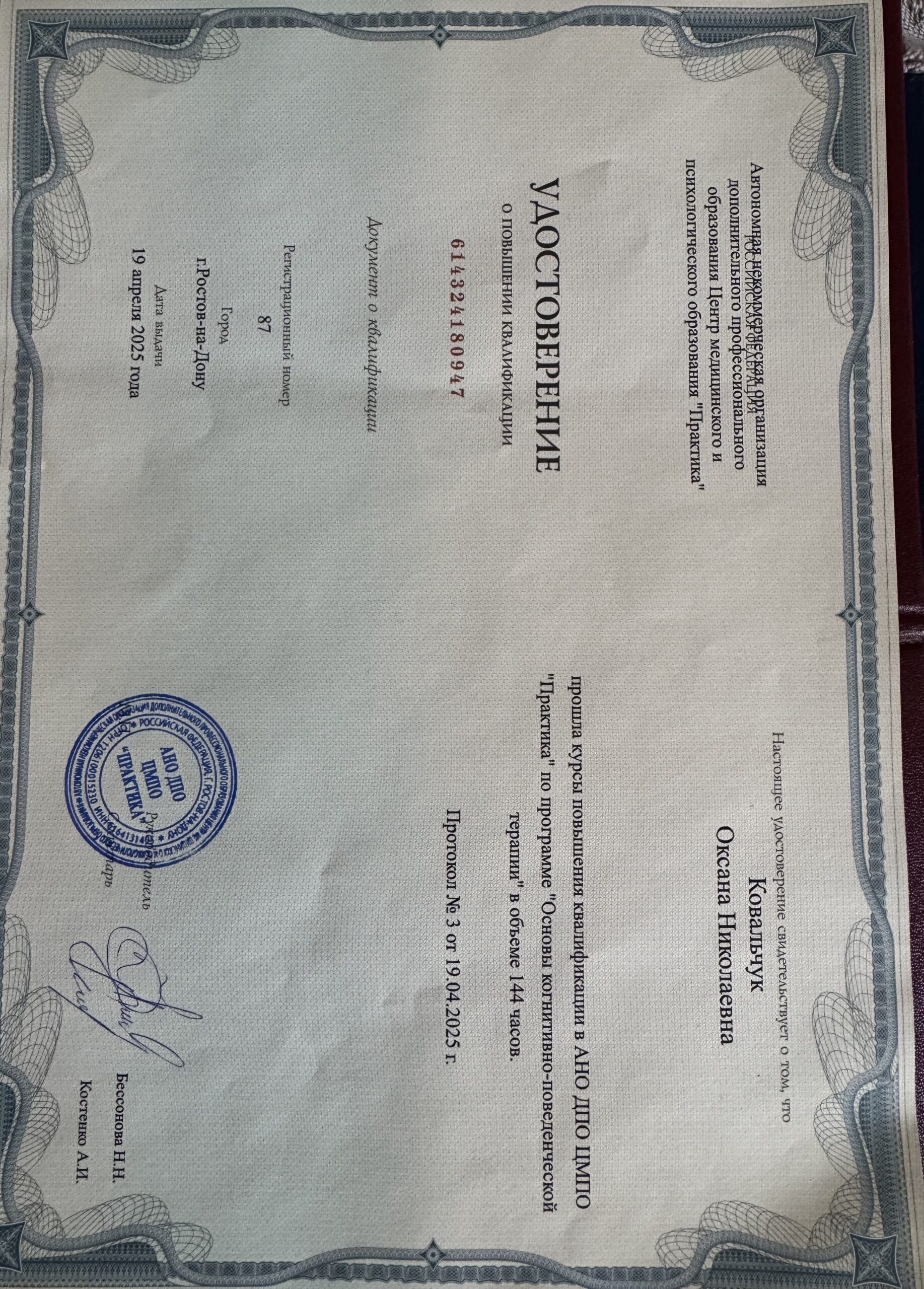 - Телесно-ориентированная терапия — 500 часов “Институт психотерапии и клинической психологии”, г. Москва;