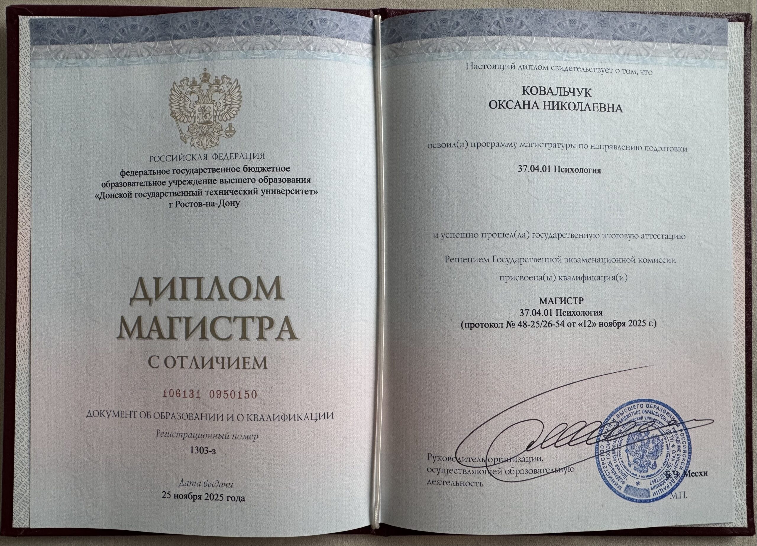 - Магистратура по психологии — более 3000 часов, ДГТУ, Ростов-на-Дону 2023 - н.в.;